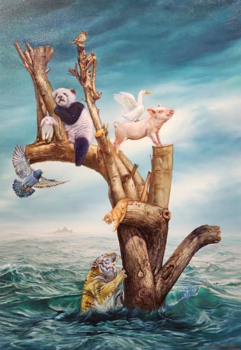 “ภาพที่ผมขอนำมาเล่านี้ ผมอยากให้ทุกคนจินตนาการถึงเรื่องราวของสิ่งมีชีวิตที่ต้องเผชิญกับภูมิอากาศที่เปลี่ยนแปลงไม่ใช่แค่กับมนุษย์เท่านั้น เหล่าน้องสัตว์เองก็เช่นกัน เรื่องเล่าในภาพนี้ มีเหล่าสัตว์อยู่หลากหลายชนิด แสดงให้เห็นถึงผลกระทบกับการที่จะต้องเอาตัวรอด หากเล่าแบบเป็นชนิดของสัตว์ น้องหมูกับเป็ด เป็นผู้มองหาความหวังและโอกาสกับการมีชีวิตอยู่ ถัดมาเป็น หมีแพนด้าที่รับได้ทุกสถานการณ์ สุข เศร้า เหงา ไปได้ทุกสถานการณ์ กระต่าย สื่อถึงเด็ก ถึงความวัยเยาว์ที่มองหาการเติบโต และ เดินต่อไปในชีวิต ส่วนเสือในภาพ มุมมองนักล่า ผู้ต้องลดตรรกะการมีชีวิตอยู่ มอบดอกไม้ให้มิตรภาพต่อ อุ้งมือแมวน้อย ที่พร้อมรับมิตรภาพนั้น รวมไปถึง นกเหยี่ยวผู้โบยบิน แต่อาจจะไปได้ไม่ไกลนักตามสถานการณ์น้ำท่วมโลก เมื่อมองไปยังด้านบนสุดของตอไม้ ยังมีนกกระจอก ที่ไม่กระจอก เพราะ มีโฟกัส มีจุดยืน ตั้งสติ และ เลือกจะตั้งตัวเองให้มีชีวิตอยู่ได้ด้วยความหวัง ”