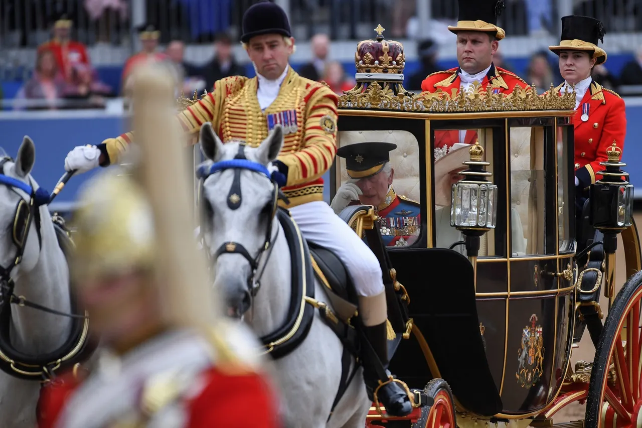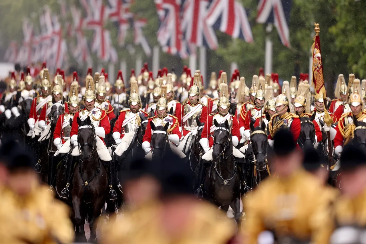 หลังจากนั้น กษัตริย์ชาร์ลส์ที่ 3 ซึ่งกำลังรับการรักษาโรคมะเร็งอยู่เช่นกัน ดำเนินการตรวจพลสวนสนามจากราชรถทองคำ ต่างจากอดีตที่ทรงตรวจพลจากหลังม้า ในขณะที่ฝูงชนต่างโห่ร้องยินดีหลังได้เห็นเจ้าหญิงเคทและคิงชาร์ลส์ เสด็จจากวังบักกิงแฮมนั่งราชรถเข้าร่วมขบวนสวนสนามของทหารม้ารักษาพระองค์