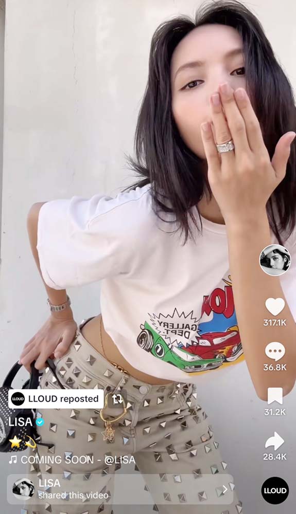 ✯✯ ทันทีที่ ลิซ่า BLACKPINK มีบัญชี TikTok พร้อมลงคลิปแรกประเดิมไปเมื่อวันที่ 6 มิถุนายน ที่ผ่านมา ก็สร้างประวัติศาสตร์ ด้วยการเป็นไอดอลเคป๊อป ที่มียอดผู้ติดตามทาง TikTok ทะลุล้านเร็วที่สุดภายใน 2 ชั่วโมง 18 นาที ล้มสถิติของ จองกุก ที่เคยทำไว้ 2 ชั่วโมง 36 นาทีไปแล้ว ที่สำคัญ ลิซ่า ยังมีผู้ติดตาม 4.98 ล้านบัญชี ภายในเวลา24 ชั่วโมงแรก จนกลายเป็นศิลปินหญิงที่มีผู้ติดตามมากที่สุดในช่วงเวลานั้น แซงหน้านางเอกภารตะ ทีปิกา ปาทุโกณ ที่เคยทำไว้ 3 ล้านบัญชีไปอีกด้วย ส่วนต้นสังกัด LLOUD นอกจากเพิ่มช่องทางอัปเดตให้เหล่าแฟนคลับได้ติดตามแล้ว ยังทำให้เหล่าบลิ้งก์ตื่นเต้น กับคำว่า COMING SOON -LISA ให้รู้ว่า ลิซ่า กำลังจะมาส่งเพลงใหม่เร็วๆ นี้