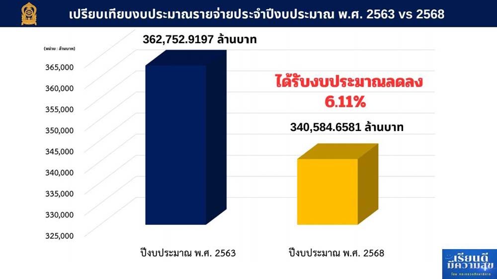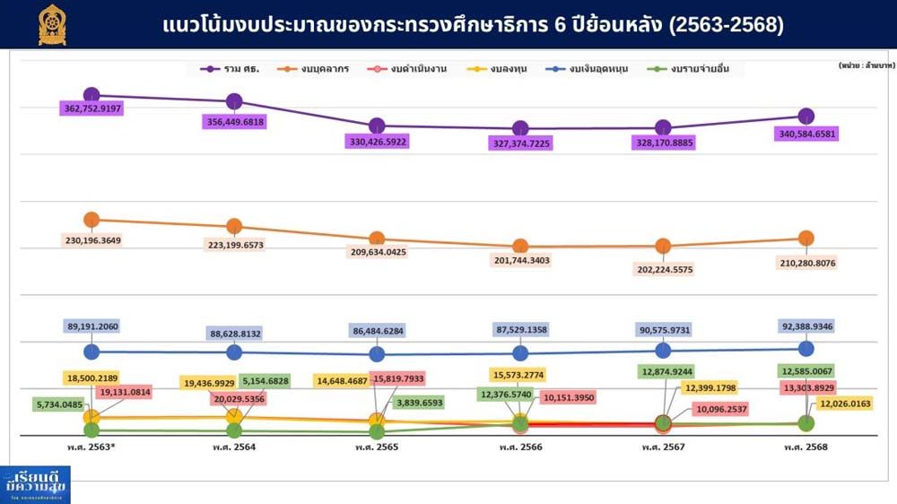 รมว.ศธ.กล่าวอีกว่า ภาพรวมงบประมาณของ ศธ. ย้อนหลัง 6 ปี (2563-2568) เห็นได้ว่าปี 2563 งบประมาณจะได้สูง จากนั้นแนวโน้มต่ำลงมาเรื่อย ๆจนกระทั่ง ปี 2567 จึงได้รับการพิจารณางบประมาณสูงขึ้น และในคำของบประมาณรายจ่ายประจำปี 2568 รัฐบาลก็ได้ให้ความสำคัญกับการศึกษา มีการปรับงบประมาณเพิ่มสูงขึ้นมากกว่าปีที่แล้ว แต่อย่างไรก็ตาม หากเทียบจากปี 2568 กับปี 2563 ยังคงลดลงคิดเป็นร้อยละ 6.11 ขณะที่โครงสร้างงบประมาณปี 2568 ศธ.ได้รับจำนวน 340,584. ล้านบาท มีงบในการพัฒนาคุณภาพผู้เรียนเพียง 11.14% จากที่ได้รับการจัดสรร