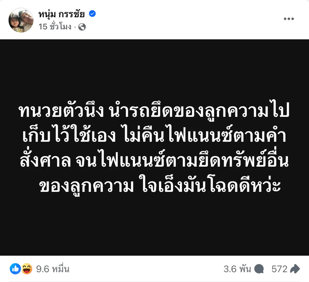 “ทนวยตัวนึง นำรถยึดของลูกความไปเก็บไว้ใช้เอง ไม่คืนไฟแนนซ์ตามคำสั่งศาล จนไฟแนนซ์ตามยึดทรัพย์อื่นของลูกความ ใจเอ็งมันโฉดดีหว่ะ”