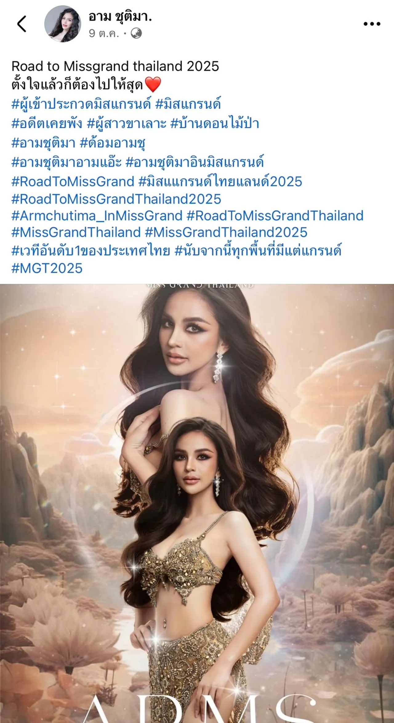 โดย อาม ชุติมา ได้โพสต์ภาพในลุคอวความสวยออร่าในชุดราตรี พร้อมเขียนข้อความระบุว่า “Road to Missgrand thailand 2025 ตั้งใจแล้วก็ต้องไปให้สุด #ผู้เข้าประกวดมิสแกรนด์ #มิสแกรนด์ #อดีตเคยพัง #ผู้สาวขาเลาะ #บ้านดอนไม้ป่า #อามชุติมา #ด้อมอามชุ #อามชุติมาอามแอ๊ะ #อามชุติมาอินมิสแกรนด์”