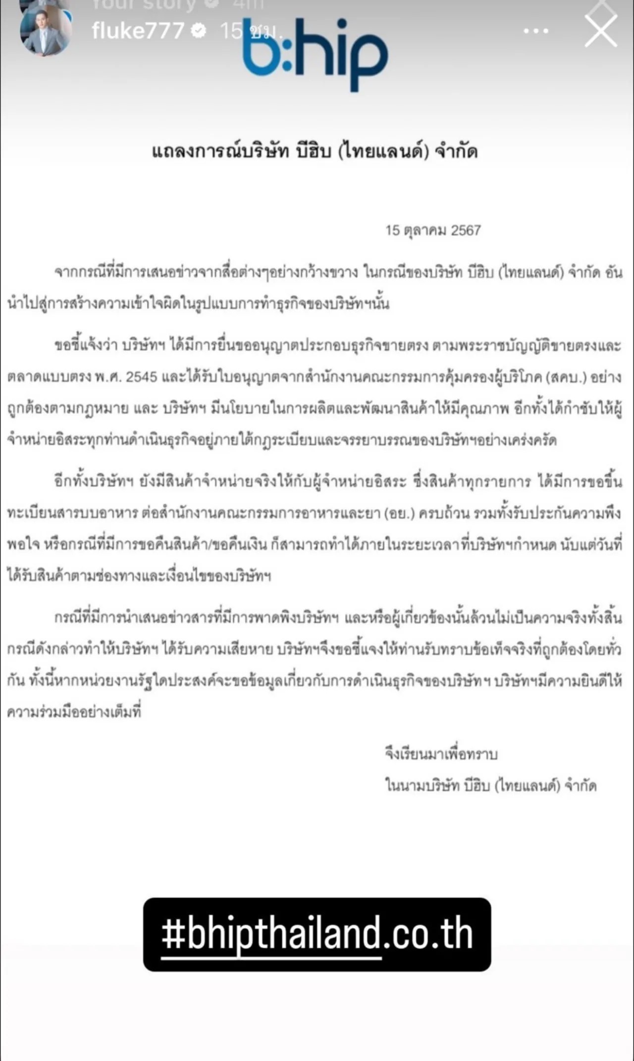 ล่าสุด ฟลุค เกริกพล ก็ได้ออกมาเคลื่อนไหวถึงในเรื่องนี้ โดยได้โพสต์จดหมายแถลงการณ์บริษัท Bhip ผ่านไอจีสตอรี่ ชี้แจงว่า ก่อตั้งธุรกิจอย่างถูกต้องและมีใบอนุญาตตามกฎหมาย กำชับให้ผู้จำหน่ายดำเนินธุรกิจตามจรรยาบรรณของบริษัทอย่างเคร่งครัด อีกทั้งสินค้ายังมี อย. ครบถ้วน ยืนยันว่าข้อมูลที่ถูกพาดพิงถึงนั้นล้วนไม่เป็นความจริง และยินดีให้ความร่วมมือให้เจ้าหน้าที่ตรวจสอบข้อมูลบริษัท