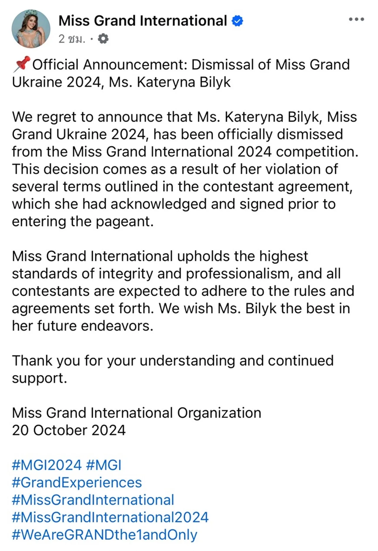 ทำเอาแฟนนางงามถึงกับตกใจมากทีเดียว หลังจากที่เฟซบุ๊กของ Miss Grand International ได้ออกมาประกาศอย่างเป็นทางการว่า ได้มีการปลดมิสแกรนด์ยูเครน 2024 คือ แคทเธอรีนา บิลิก จากการประกวด Miss Grand International 2024 ก่อนวันประกวดรอบตัดสินในวันที่ 25 ต.ค. เพียง 5 วัน โดยให้เหตุผลว่า ได้มีการละเมิดข้อตกลงของผู้เข้าประกวด
