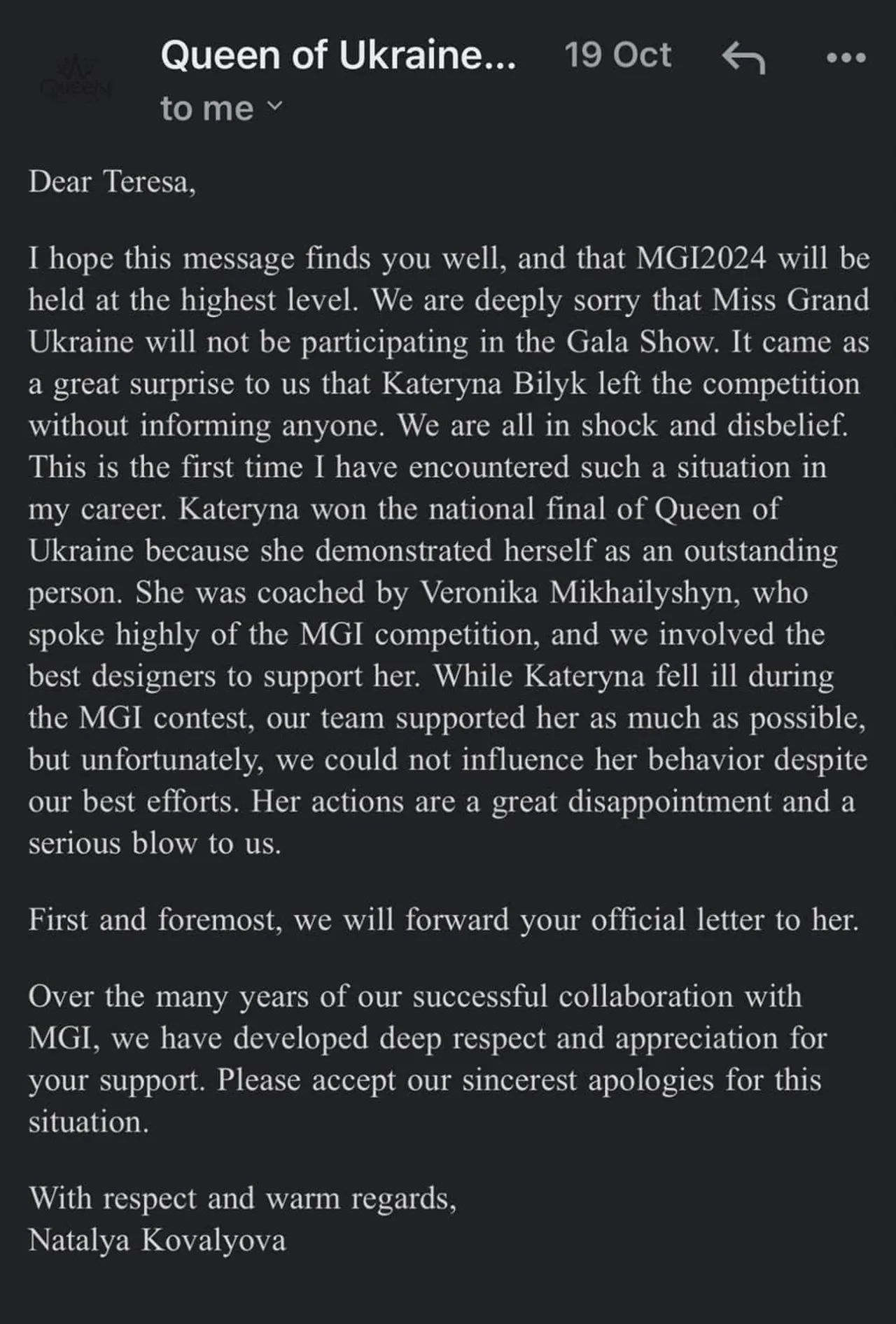 เราเสียใจที่ต้องแจ้งให้ทราบว่า Kateryna Bilyk มิสแกรนด์ยูเครน 2024 ได้ถูกปลดจากการประกวด Miss Grand International 2024 อย่างเป็นทางการ