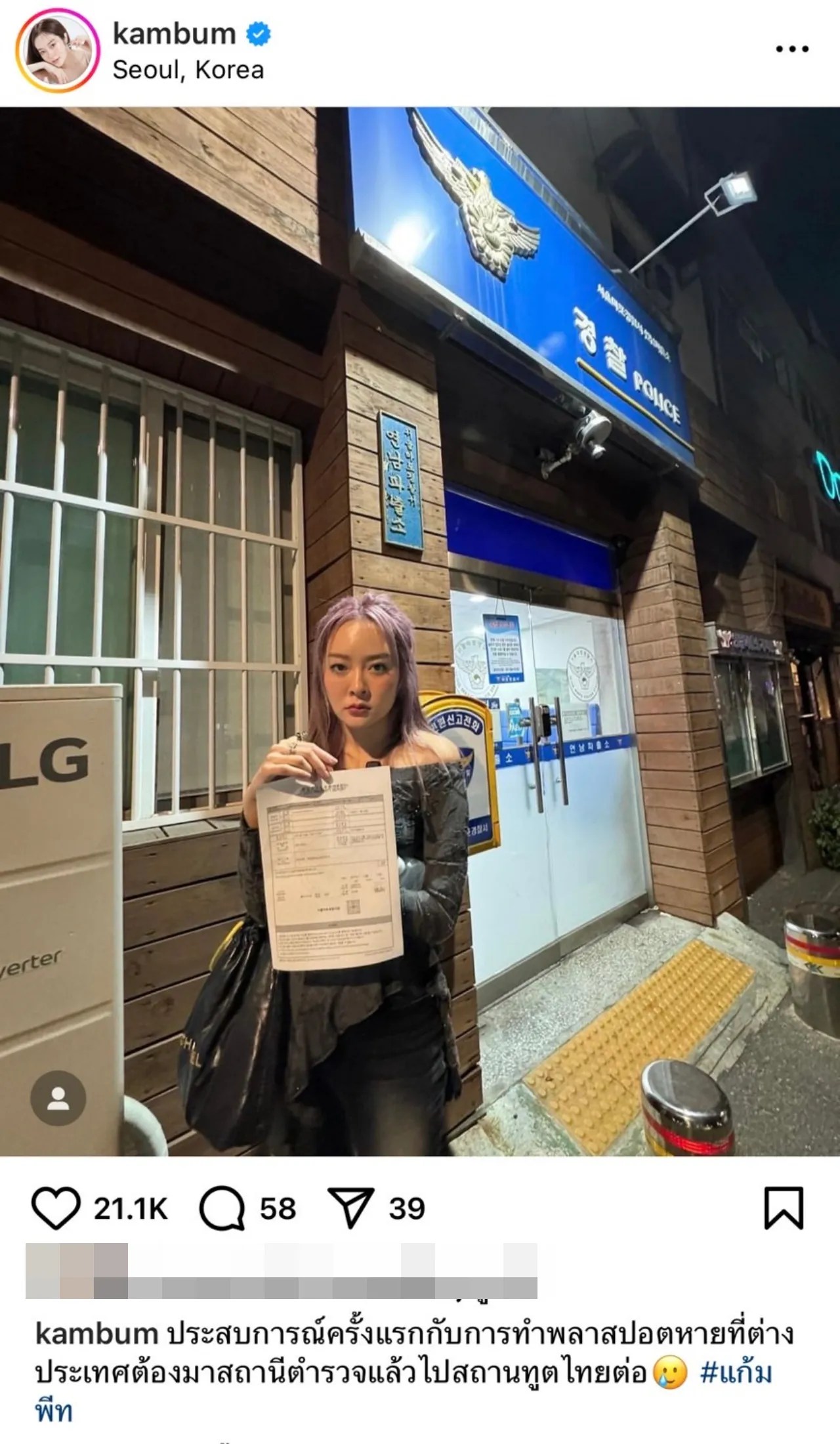 โดยเจ้าตัวได้โพสต์ภาพผ่านอินสตาแกรมขณะถือใบแจ้งความ และเขียนว่า “ประสบการณ์ครั้งแรกกับการทำพาสปอร์ตหายที่ต่างประเทศต้องมาสถานีตำรวจแล้วไปสถานทูตไทยต่อ #แก้มพีท”