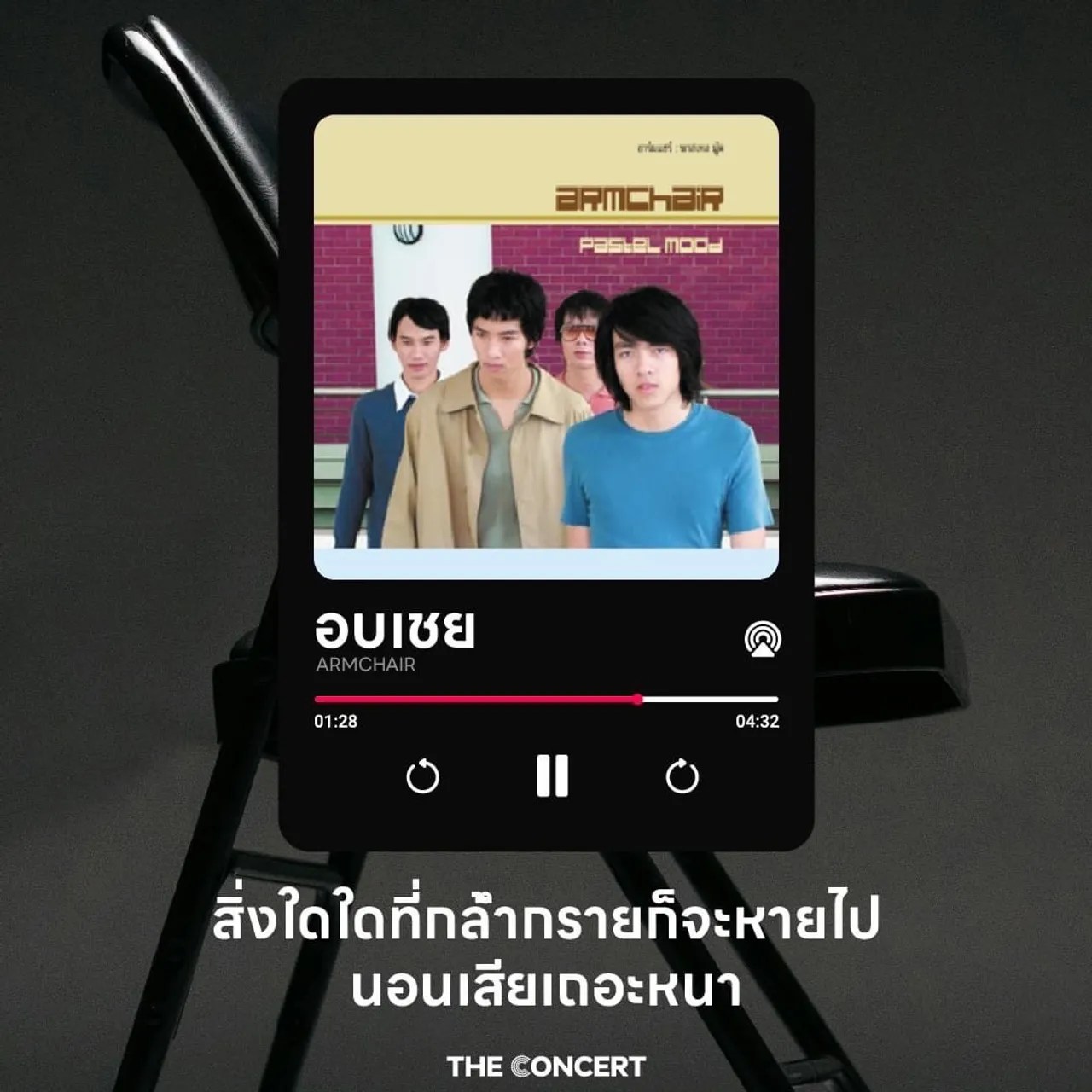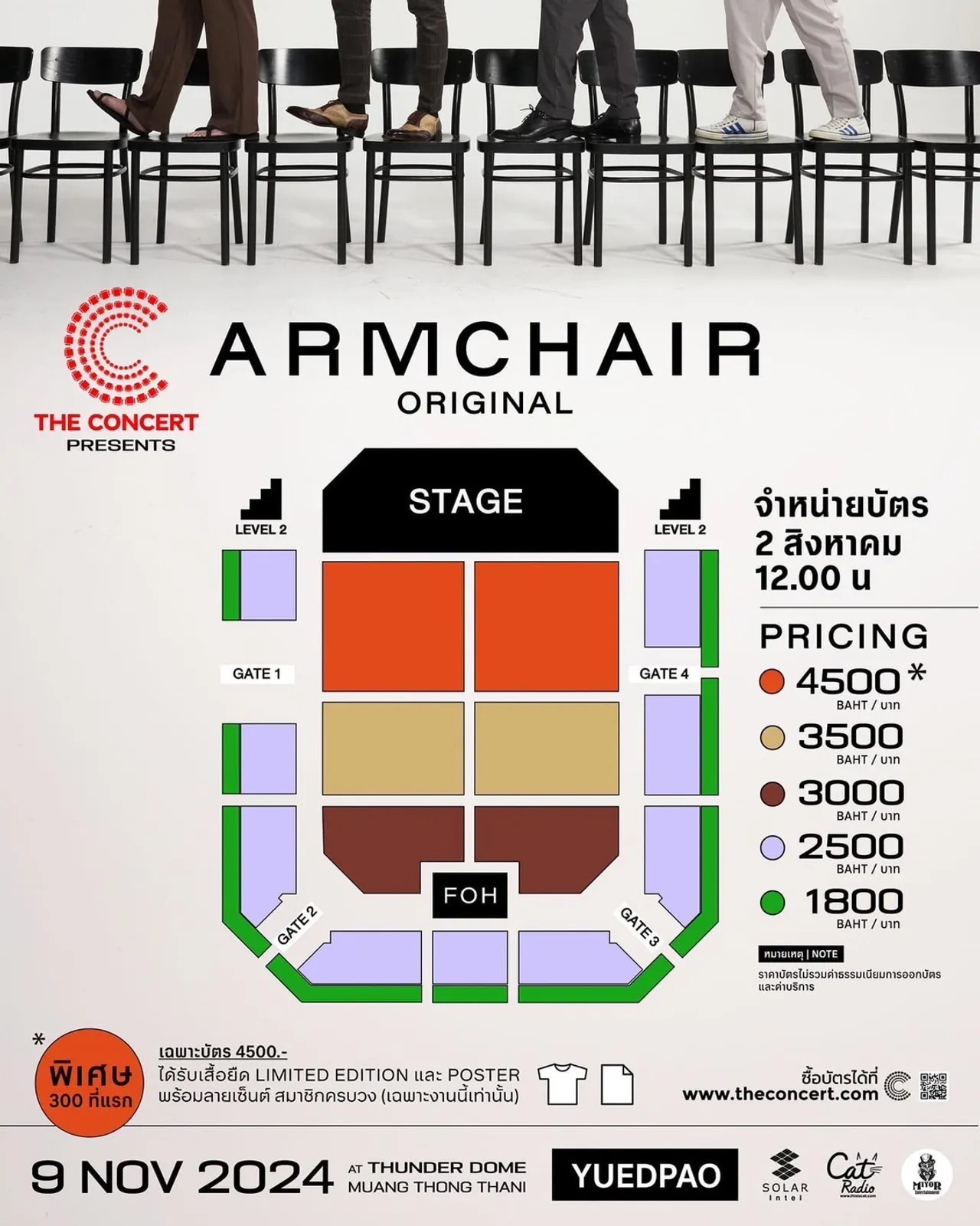 เตรียมมาย้อนบรรยากาศที่คุณคิดถึงกับบทเพลงที่มีเอกลักษณ์และสไตล์เฉพาะ ที่ทำให้คุณตกหลุมรักพวกเขากับ ไปด้วยกัน ในคอนเสิร์ตใหญ่เต็มรูปแบบที่มี Line Up พวกเราทั้ง 4 คน จะได้ร่วมเล่นด้วยกันครั้งสุดท้าย ใน THE CONCERT Present “ARMCHAIR Original Concert” เพียงรอบการแสดงเดียวเท่านั้น ในวัน เสาร์ ที่ 9 พฤศจิกายน 2567 เวลา 19.00 น. สถานที่ : THUNDER DOME MUANG THONG THANI ซื้อบัตรได้ทาง The Concert Application