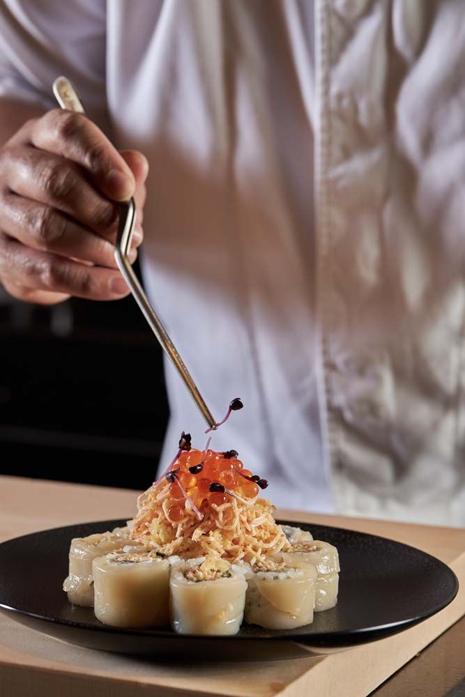 ต่อด้วย อังกิโมะ (Ankimo) อาหารยอดนิยมของญี่ปุ่น ทำจากตับของปลาอังโกะ นำมานึ่ง และเสิร์ฟเย็นพร้อมอังกิโมะไอศกรีมโมนากะสุดสร้างสรรค์ที่เชฟอัลวินบรรจงตกแต่งอย่างประณีตด้วยแตงโมหั่นเต๋า ผักดองนาราซึเกะ (ผักดองพื้นเมืองของเมืองนารา) ดอกไม้รับประทานได้ และใบชิโซะ (shiso) เพิ่มกลิ่นหอมของสมุนไพร ไม่ว่าคุณจะเลือกเมนูอะลาคาร์ตที่คัดสรรมาเป็นอย่างดี เทสติ้งเมนู ไปจนถึงเทโชกุ หรือชุดอาหารกลางวันสไตล์ญี่ปุ่นที่ใช้วัตถุดิบหายากและจัดเตรียมอย่างเป็นเอกลักษณ์ทุกเมนูล้วนมอบประสบการณ์การเดินทางผ่านรสชาติอาหารญี่ปุ่นสไตล์โมเดิร์นที่น่าตื่นเต้น