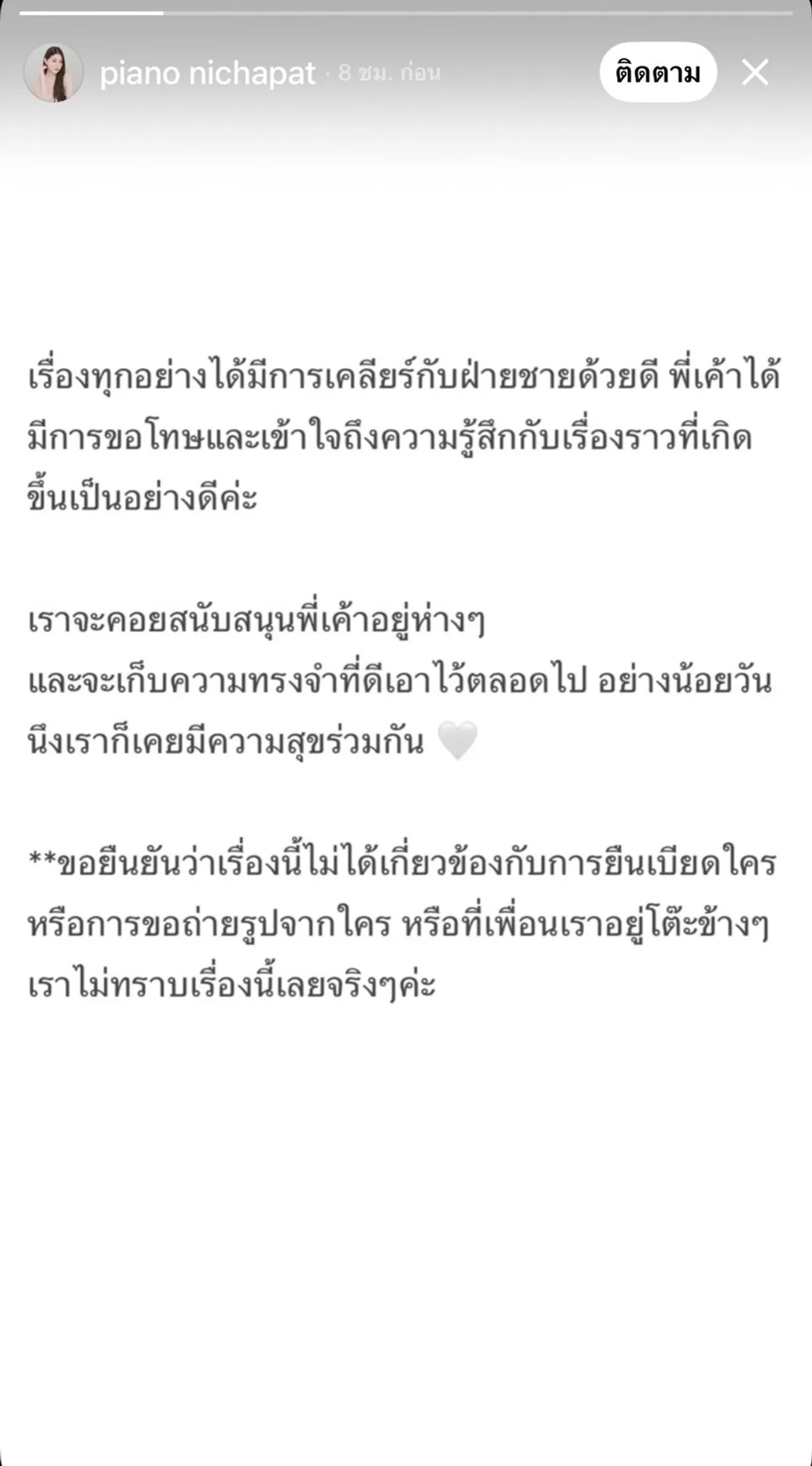 ล่าสุด เปียโน ณิชาภัทร ก็ได้โพสต์ภาพข้อความลงในสตอรี่ TikTok @piano_nichapat ซึ่งมีเนื้อหาว่า “เรื่องทุกอย่างได้มีการเคลียร์กับฝ่ายชายด้วยดี พี่เค้าได้มีการขอโทษและเข้าใจถึงความรู้สึกกับเรื่องราวที่เกิดขึ้นเป็นอย่างดีค่ะ