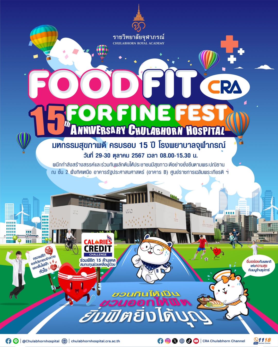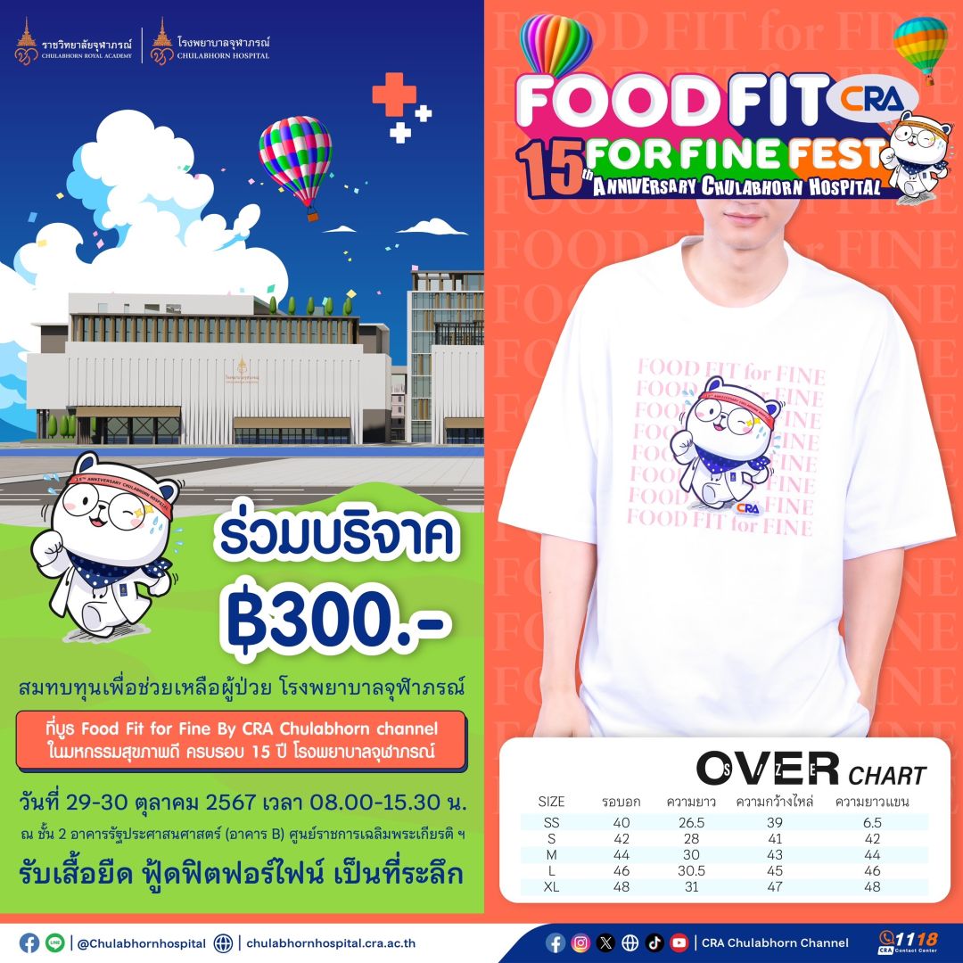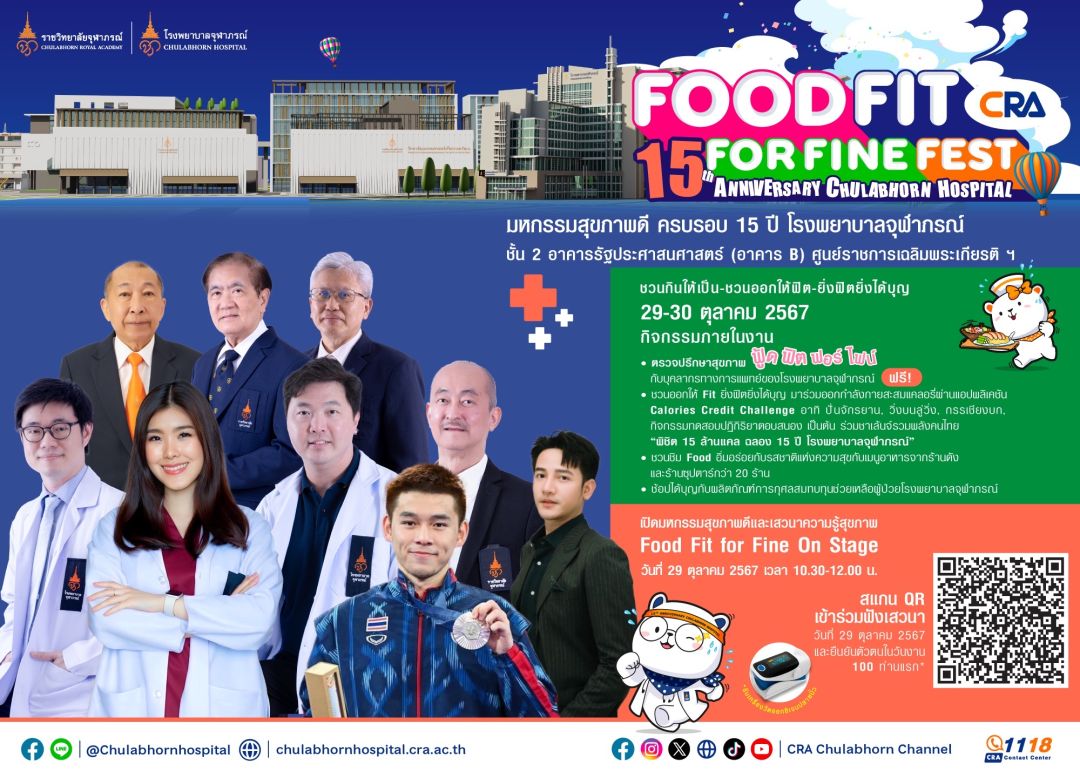 เชิญชวนผู้ที่รักสุขภาพร่วมงานมหกรรมสุขภาพดี “ CRA Food Fit for Fine Fest ” เนื่องในโอกาสครบรอบ 15 ปี โรงพยาบาลจุฬาภรณ์ รวมพลังฟู้ดฟิตฟอร์ไฟน์ ชวนกินให้เป็น-ชวนออกให้ฟิต-ยิ่งฟิตยิ่งได้บุญ ผนึกกำลังสร้างสรรค์และผลักดันให้ประชาชนมีสุขภาวะดีอย่างยั่งยืนตามพระปณิธาน ในวันที่ 29 – 30 ตุลาคม 2567 เวลา 08.00-15.30 น. ณ ชั้น 2 ฝั่งทิศเหนือ อาคารรัฐประศาสนศาสตร์ (อาคารบี) ศูนย์ราชการเฉลิมพระเกียรติ ฯ ถนนแจ้งวัฒนะ ร่วมรณรงค์ส่งเสริมการดูแลเชิงป้องกันเพื่อให้ประชาชนคนไทยมีสุขภาวะดี กินดี ได้สุขภาพดีควบคู่กับการส่งเสริมการออกกำลังกายเพื่อลดปัจจัยเสี่ยงโรค NCDs หรือกลุ่มโรคไม่ติดต่อเรื้อรัง เช่น โรคเบาหวาน โรคไขมันในเลือดสูง โรคความดันโลหิตสูง ซึ่งโรคเหล่านี้อาจนำไปสู่โรคที่รุนแรงยิ่งขึ้นอย่างโรคหลอดเลือดหัวใจ โรคไตเรื้อรัง เป็นต้น
