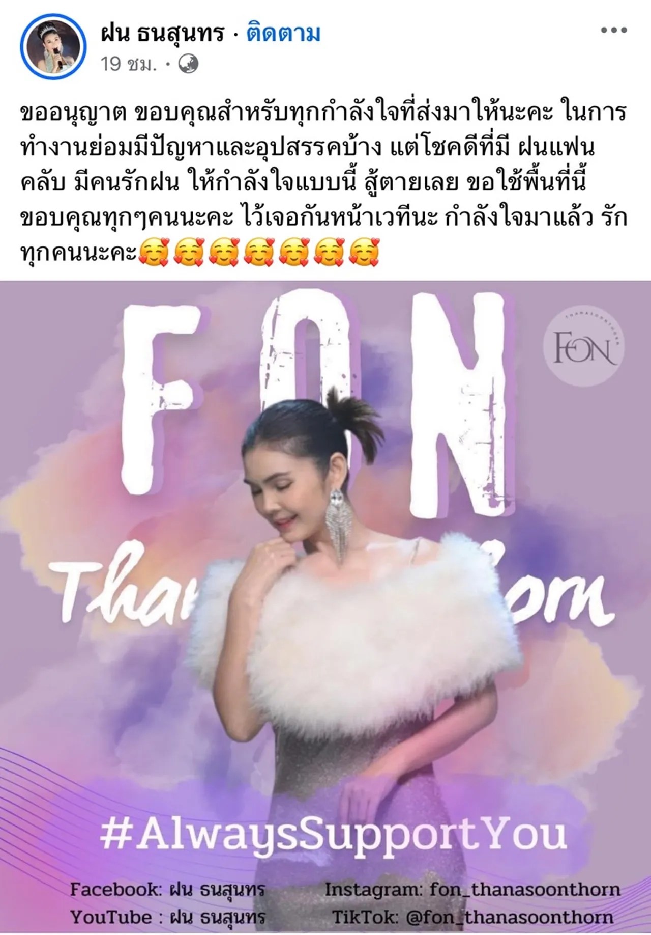 ล่าสุด ฝน ธนสุนทร ก็ได้เคลื่อนไหวแล้ว พร้อมกับโพสต์ข้อความขอบคุณทุกกำลังใจที่ส่งมาให้