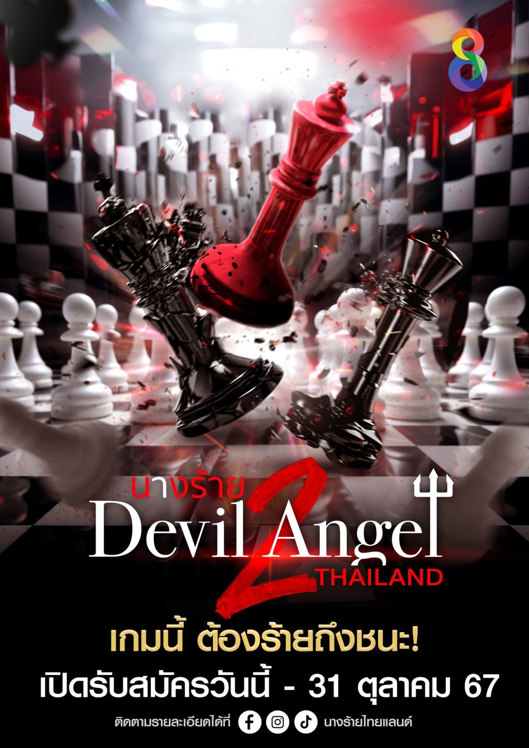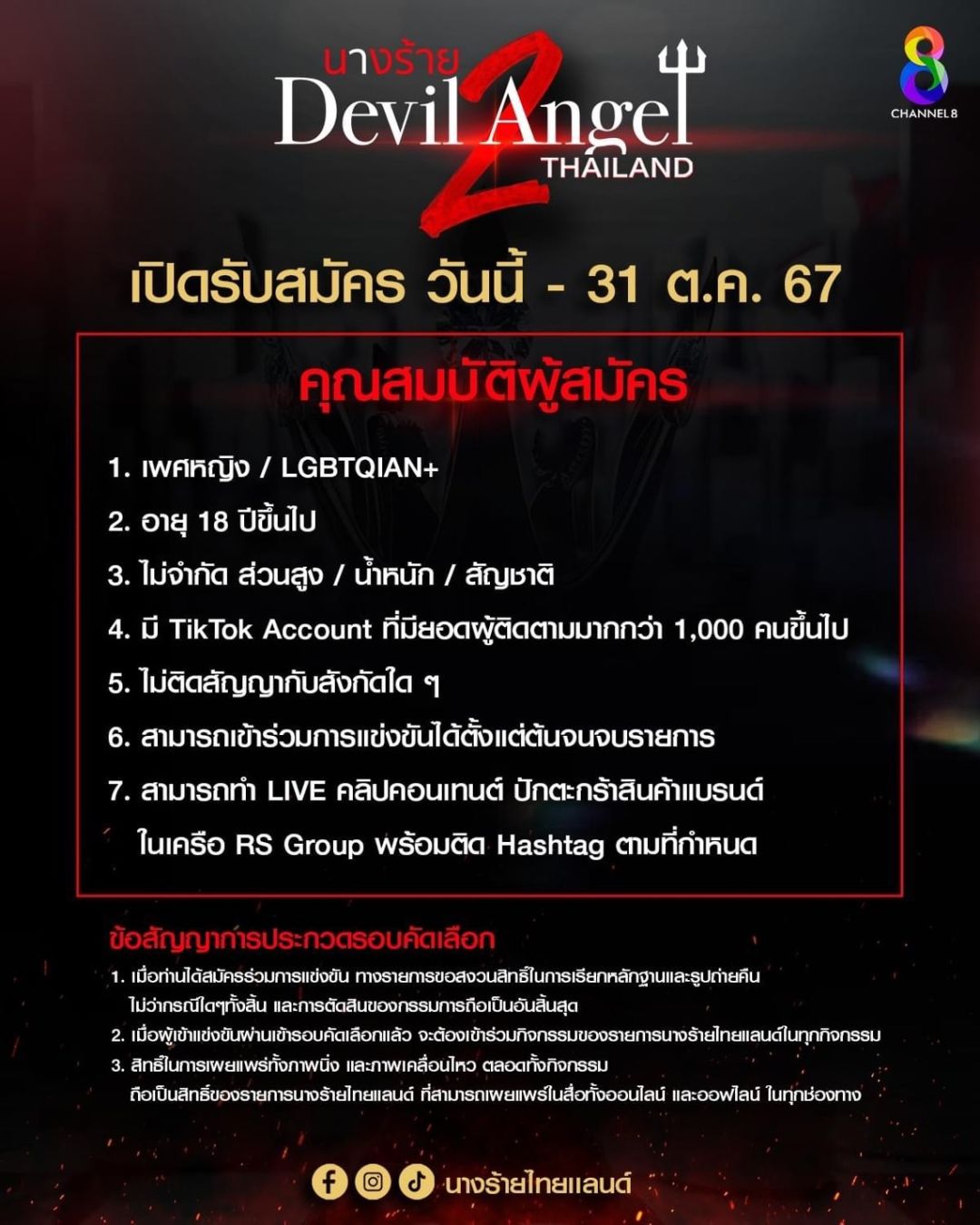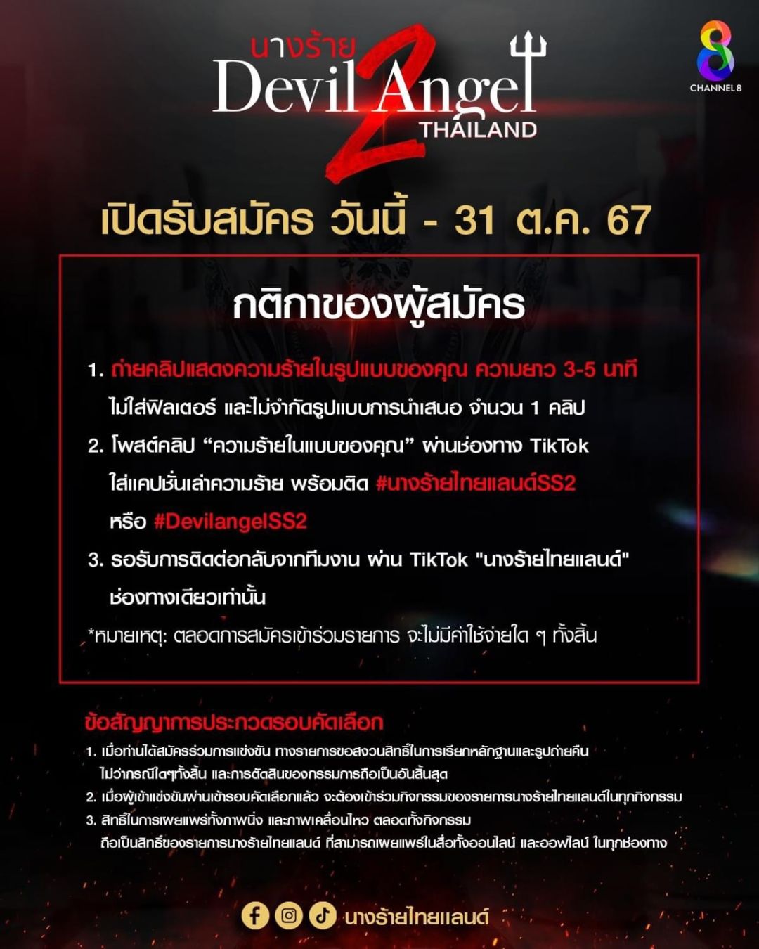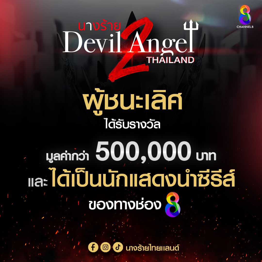 ถ้าคิดว่าร้ายได้มากกว่า แล้วเจอกัน! ผู้สมัครนางร้ายไทยแลนด์Season2สามารถสอบถามดูกติการับสมัครและติดตามรายละเอียดเพิ่มเติมได้ที่ Facebook / Instagram / TikTok : นางร้ายไทยแลนด์ และ ทุกแพลตฟอร์มโซเชียลของช่อง 8