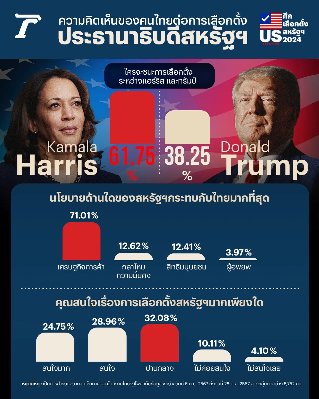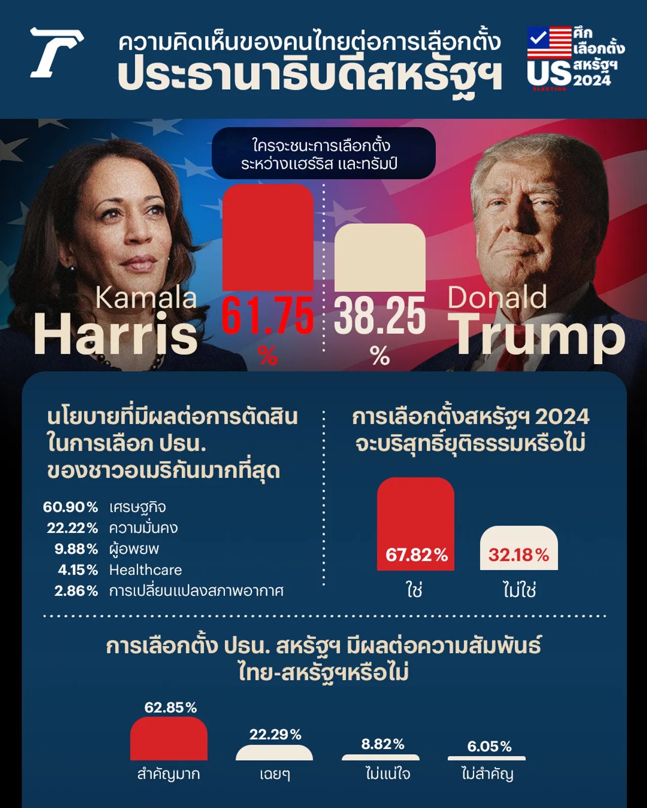 โพลเผย คนไทยส่วนใหญ่คิดว่าแฮร์ริสน่าจะคว้าชัยเลือกตั้งประธานาธิบดีสหรัฐฯ โดยปัจจัยที่สำคัญในการตัดสินใจของชาวอเมริกันเป็นเรื่องของเศรษฐกิจ