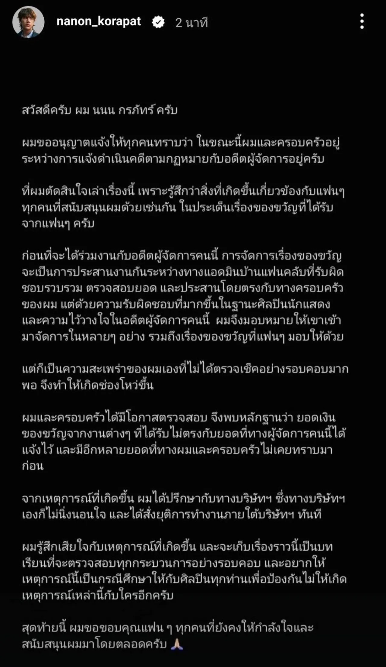 “สวัสดีครับผม นนน กรภัทร์ ครับ ผมขออนุญาตแจ้งให้ทุกคนทราบว่า ในขณะนี้ผมและครอบครัวอยู่ ระหว่างการแจ้งดำเนินคดีตามกฎหมายกับอดีตผู้จัดการอยู่ครับ ที่ผมตัดสินใจเล่าเรื่องนี้ เพราะรู้สึกว่าสิ่งที่เกิดขึ้นเกี่ยวข้องกับแฟน ๆ ทุกคนที่สนับสนุนผมด้วยเช่นกัน ในประเด็นเรื่องของขวัญที่ได้รับจากแฟนๆ ครับ