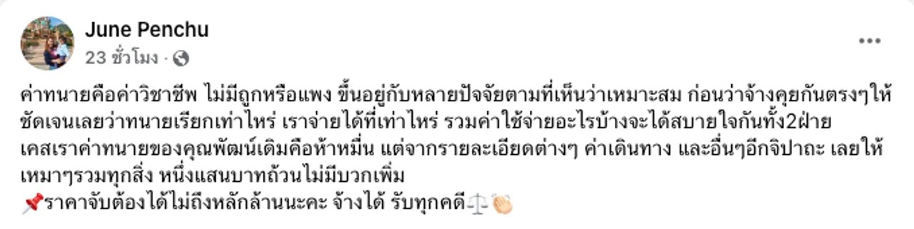 ซึ่งแม่จูนได้เขียนข้อความเอาไว้ว่า “ค่าทนายคือค่าวิชาชีพ ไม่มีถูกหรือแพง ขึ้นอยู่กับหลายปัจจัยตามที่เห็นว่าเหมาะสม ก่อนว่าจ้างคุยกันตรงๆ ให้ชัดเจนเลยว่าทนายเรียกเท่าไหร่ เราจ่ายได้ที่เท่าไหร่ รวมค่าใช้จ่ายอะไรบ้างจะได้สบายใจกันทั้ง 2 ฝ่าย