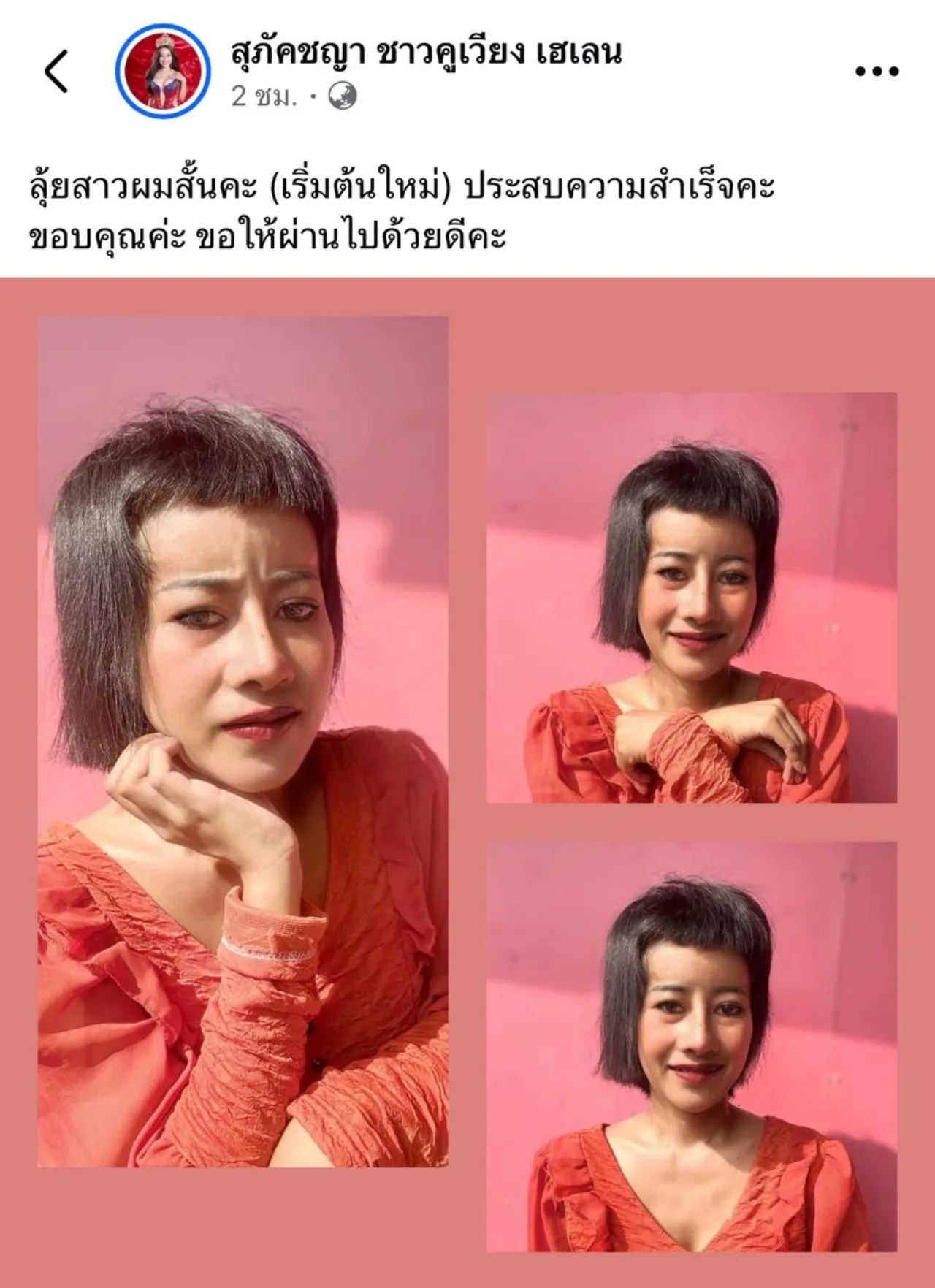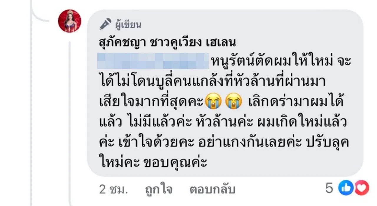 “ลุคสาวผมสั้นค่ะ (เริ่มต้นใหม่) ประสบความสำเร็จค่ะ ขอบคุณค่ะ ขอให้ผ่านไปด้วยดีค่ะ” และยังบอกอีกว่า “หนูรัตน์เคยเรียนตัดผมมาค่ะ ตัดเองได้ค่ะ ตัดร้านแพง เสียเงินเปล่าค่ะ ทำได้ทุกอย่างค่ะ หนูรัตน์ตัดผมให้ใหม่ จะได้ไม่โดนบูลลี่คนแกล้งที่หัวล้านที่ผ่านมา เสียใจมากที่สุดค่ะ เลิกดราม่าผมได้แล้ว ไม่มีแล้วค่ะ หัวล้านค่ะ ผมเกิดใหม่แล้วค่ะ เข้าใจด้วยค่ะ อย่าแกงกันเลยค่ะ ปรับลุคใหม่ค่ะ ขอบคุณค่ะ”