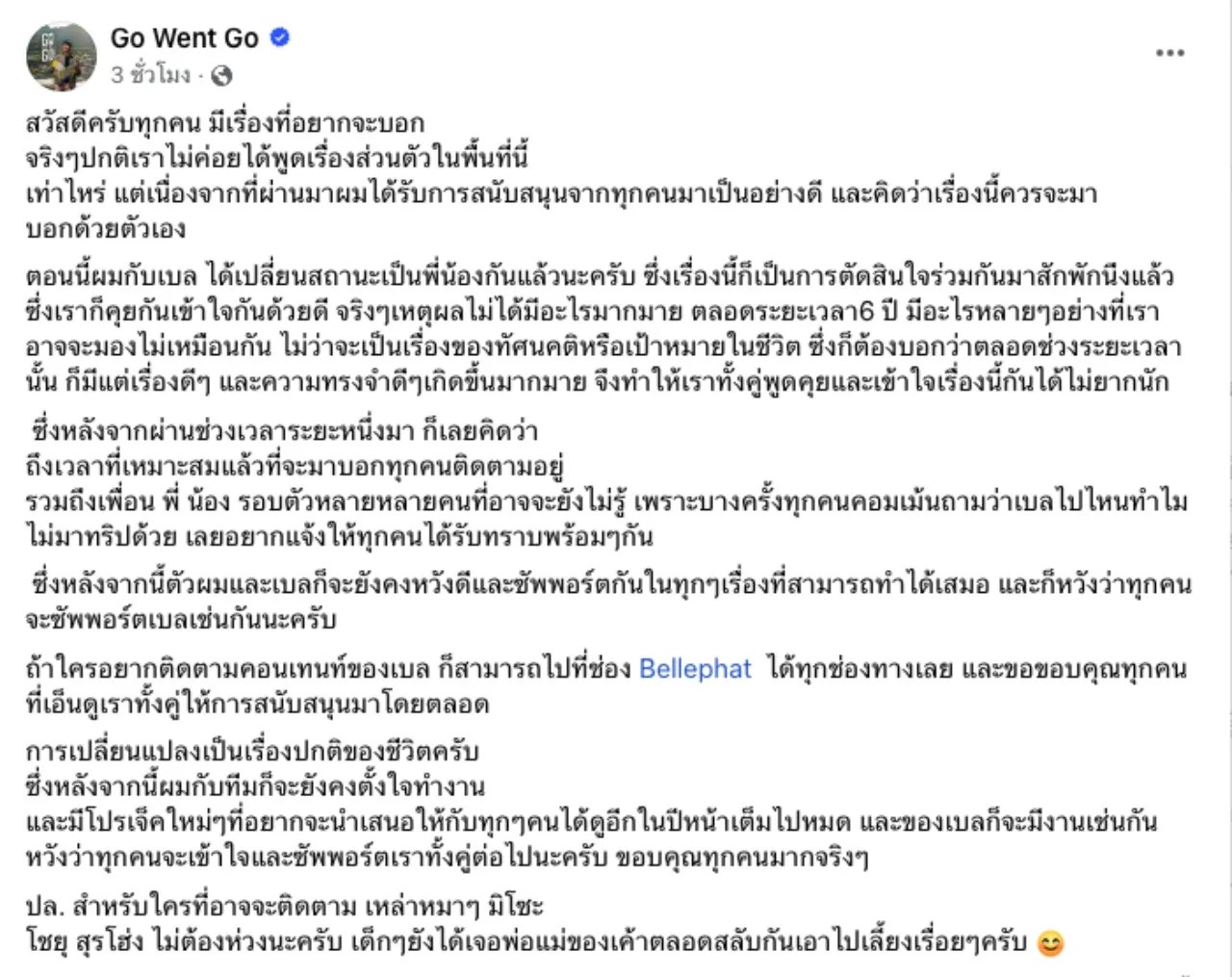 ตอนนี้ผมกับเบล ได้เปลี่ยนสถานะเป็นพี่น้องกันแล้วนะครับ ซึ่งเรื่องนี้ก็เป็นการตัดสินใจร่วมกันมาสักพักหนึ่งแล้ว ซึ่งเราก็คุยกันเข้าใจกันด้วยดี จริงๆ เหตุผลไม่ได้มีอะไรมากมาย ตลอดระยะเวลา 6 ปี มีอะไรหลายๆ อย่างที่เราอาจจะมองไม่เหมือนกัน ไม่ว่าจะเป็นเรื่องของทัศนคติหรือเป้าหมายในชีวิต ซึ่งก็ต้องบอกว่าตลอดช่วงระยะเวลานั้น ก็มีแต่เรื่องดีๆ และความทรงจำดีๆ เกิดขึ้นมากมาย จึงทำให้เราทั้งคู่พูดคุยและเข้าใจเรื่องนี้กันได้ไม่ยากนัก
