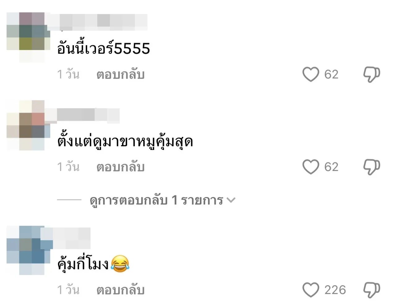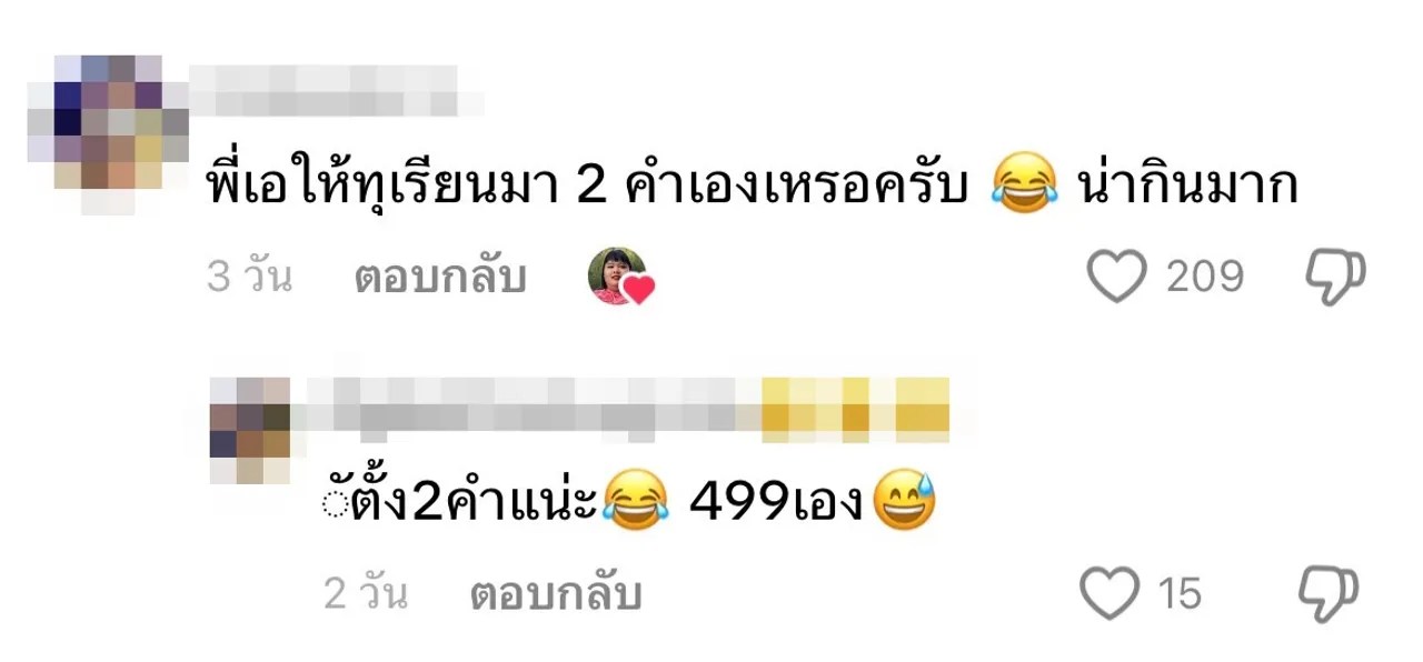 “พี่เอให้ทุเรียนมา 2 คำเองเหรอครับ น่ากินมาก, 499 นี่แพงตรงข้าวเหนียวใช่มั้ย, ตั้งแต่ดูมา อันนี้ปริมาณสวนทางกับราคาที่สุด, ข้าวเหนียวอร่อยมาก แต่กินทุเรียนอย่างเดียว ข้าวเหนียวเหลือเท่าเดิม, ถ้วยอย่างใหญ่ ข้างในมีนิดเดียว, คุ้มกี่โมง, ตั้งแต่ดูมาขาหมูคุ้มสุด, คุ้มกี่โมง เมนูที่คุ้มสุดคือ ขาหมูพะโล้ นอกนั้น สวนทางกัน”