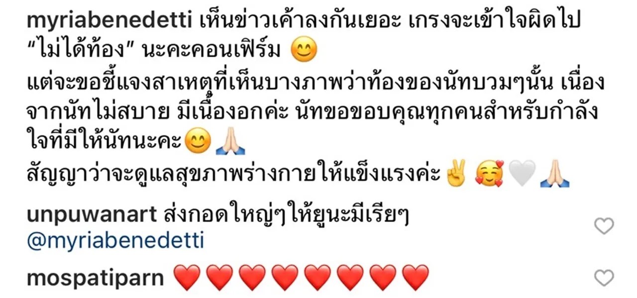 ล่าสุด นัท มีเรีย ก็ได้ออกมาเคลื่อนไหวเกี่ยวกับเรื่องนี้แล้ว โดยยืนยันว่า เธอนั้นไม่ได้ท้องแน่นอน แต่ภาพบางส่วนที่เห็นว่าท้องบวมๆ ก็เพราะได้ป่วยมีเนื้องอกนั่นเอง
