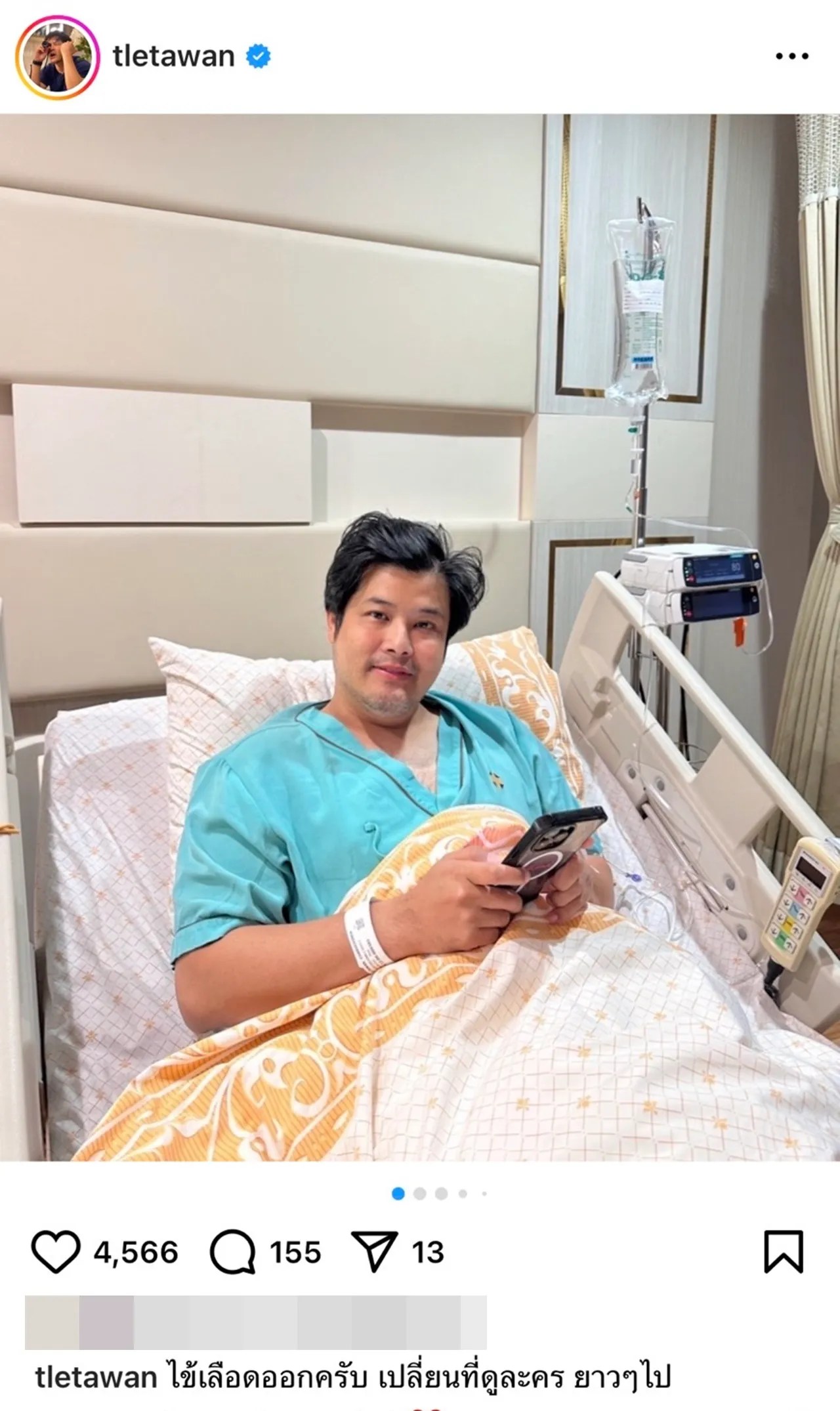 ออกมาโพสต์ภาพขณะนอนอยู่บนเตียงผู้ป่วย สำหรับ เติ้ล ตะวัน นักแสดงและผู้จัดละครคนดัง โดยเจ้าตัวได้ป่วยเป็นโรคไข้เลือดออก และตอนนี้ถึงมือหมอเป็นที่เรียบร้อยแล้ว