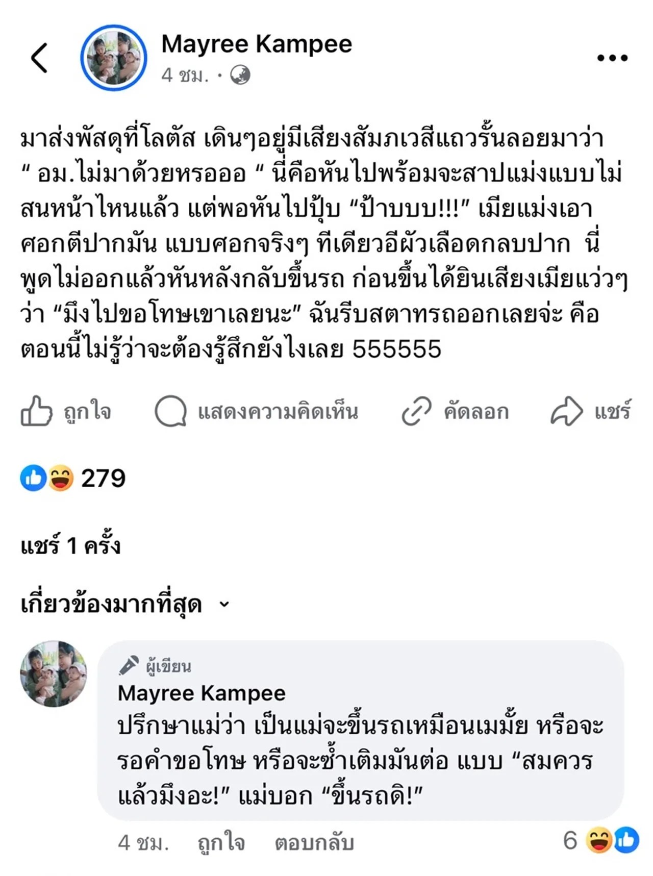 และเขียนในคอมเมนต์เพิ่มเติมว่า “ปรึกษาแม่ว่า เป็นแม่จะขึ้นรถเหมือนเมมั้ย หรือจะรอคำขอโทษ หรือจะซ้ำเติมมันต่อ แบบ “สมควรแล้วมึงอะ!” แม่บอก “ขึ้นรถดิ!””