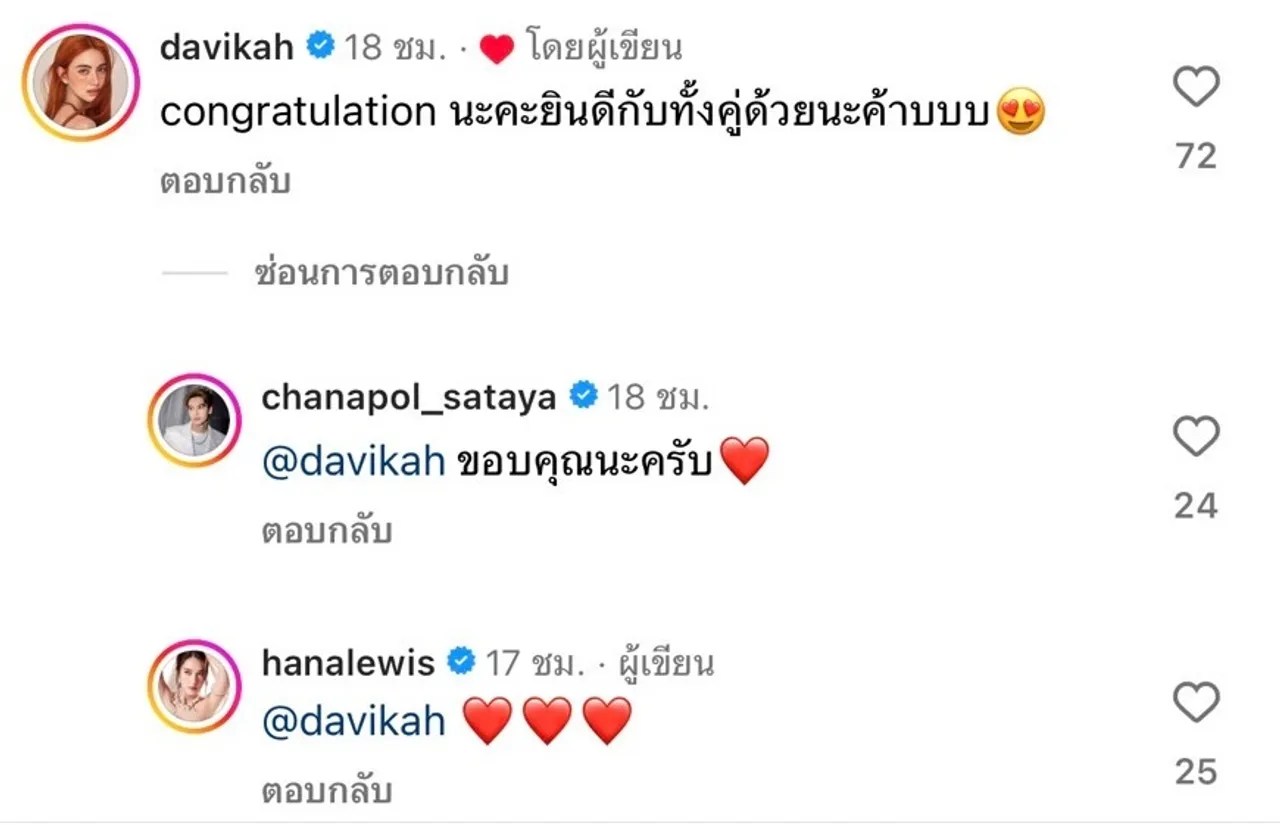 ซึ่ง ใหม่ ดาวิกา ก็ได้เข้ามาคอมเมนต์ตอบกลับว่า “congratulation นะคะ ยินดีกับทั้งคู่ด้วยนะค้าบบบ” และ ฮาน่า ตอบกลับเป็นอีโมจิรูปหัวใจ ส่วน อ๊อฟ บอกว่า “ขอบคุณนะครับ”