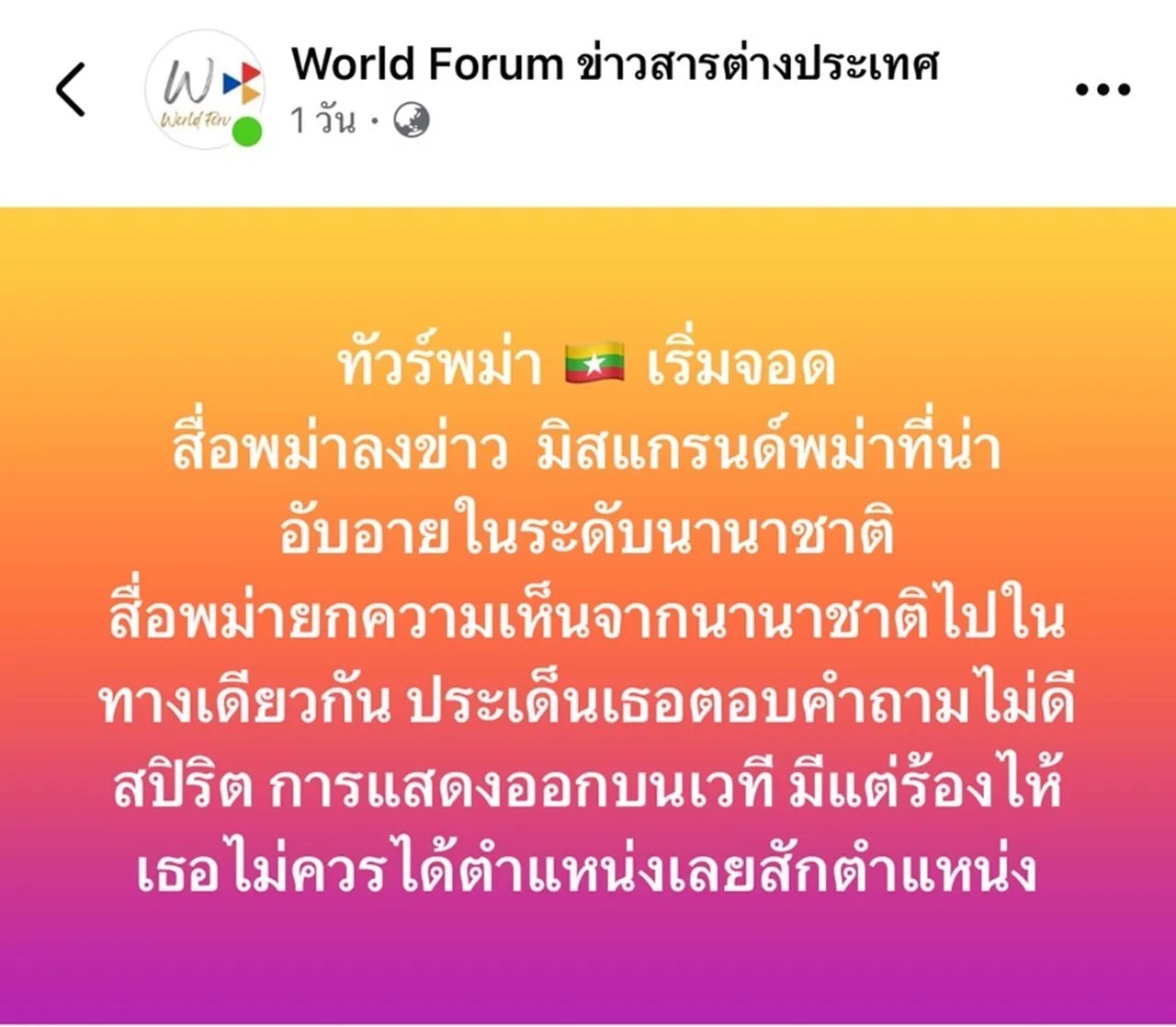 ซึ่งในเรื่องนี้ ทางเฟซบุ๊กเพจ World Forum ข่าวสารต่างประเทศ โพสต์รายงานเกี่ยวกับสื่อของ เมียนมา ถึงนางงามคนดัง ระบุว่า “ทัวร์พม่า เริ่มจอด สื่อพม่าลงข่าว มิสแกรนด์พม่าที่น่าอับอายในระดับนานาชาติ สื่อพม่ายกความเห็นจากนานาชาติไปในทางเดียวกัน ประเด็นเธอตอบคำถามไม่ดี สปิริต การแสดงออกบนเวที มีแต่ร้องไห้ เธอไม่ควรได้ตำแหน่งเลยสักตำแหน่ง”