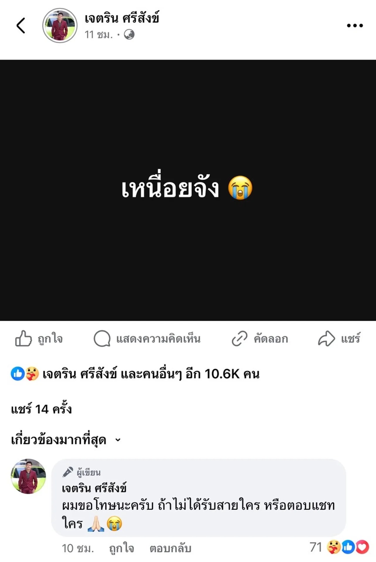 ด้าน เนเงิน ก็โพสต์ข้อความสั้นๆ “เหนื่อยจัง” พร้อมทั้งใส่พื้นหลังสีดำและอีโมจิร้องไห้ อีกทั้งยังเขียนข้อความเพิ่มเติมในคอมเมนต์ว่า “ผมขอโทษนะครับ ถ้าไม่ได้รับสายใคร หรือตอบแชทใคร” ด้วย