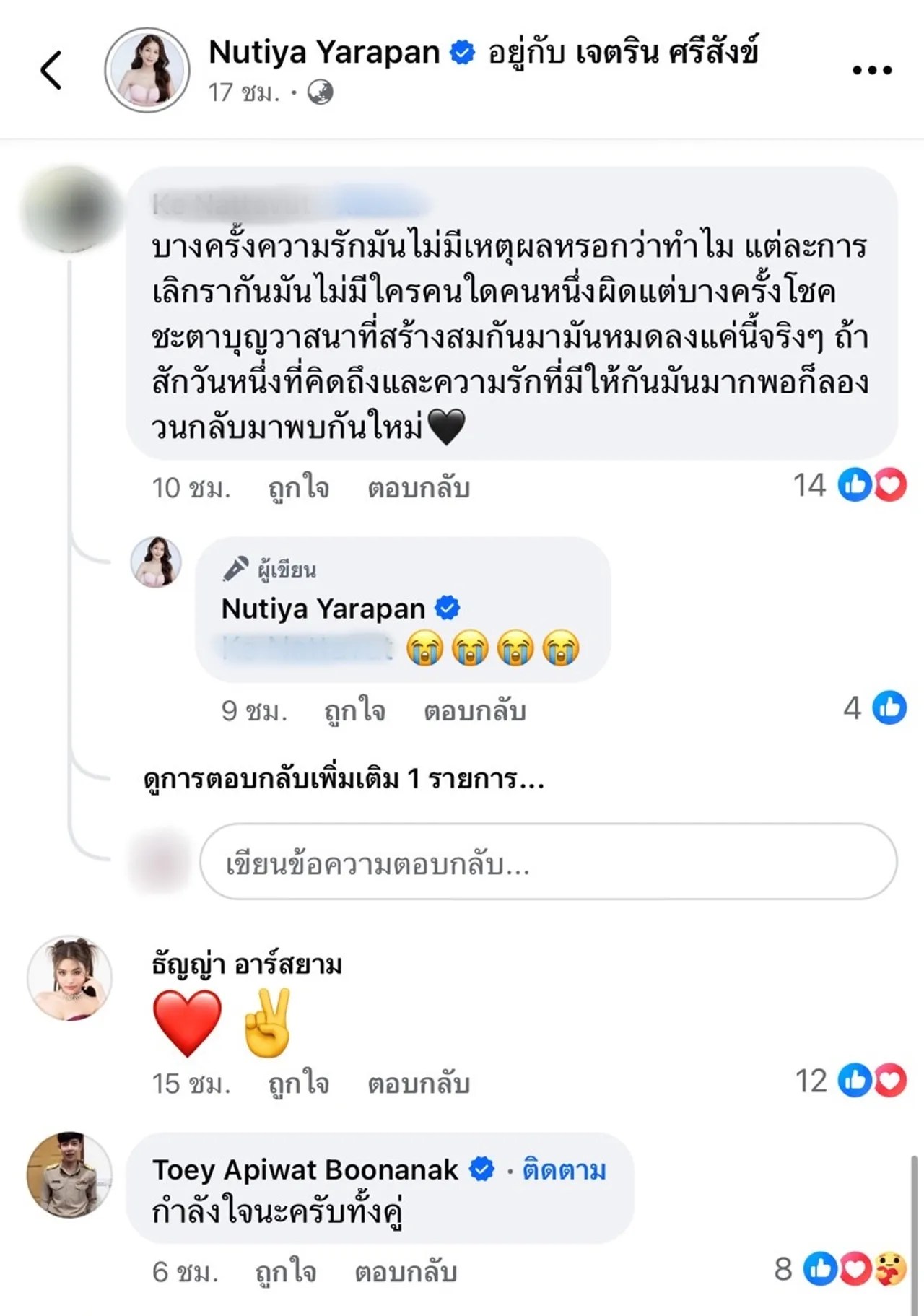 ซึ่งหลังจากที่ ครูเบียร์ โพสต์ข้อความไปก็มีแฟนๆ เข้ามาแสดงความคิดเห็นและให้กำลังใจเป็นจำนวนมาก และเมื่อมีคนเข้าไปแสดงความคิดเห็นว่า “บางครั้งความรักมันไม่มีเหตุผลหรอกว่าทำไม แต่ละการเลิกรากันมันไม่มีใครคนใดคนหนึ่งผิด แต่บางครั้งโชคชะตาบุญวาสนาที่สร้างสมกันมามันหมดลงแค่นี้จริงๆ ถ้าสักวันหนึ่งที่คิดถึงและความรักที่มีให้กันมันมากพอก็ลองวนกลับมาพบกันใหม่” ครูเบียร์ ก็ตอบกลับด้วยอีโมจิร้องไห้