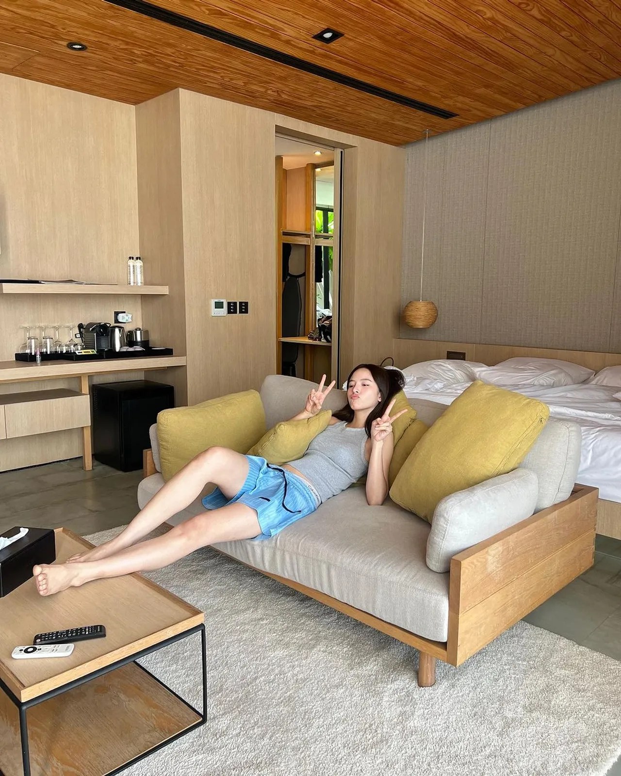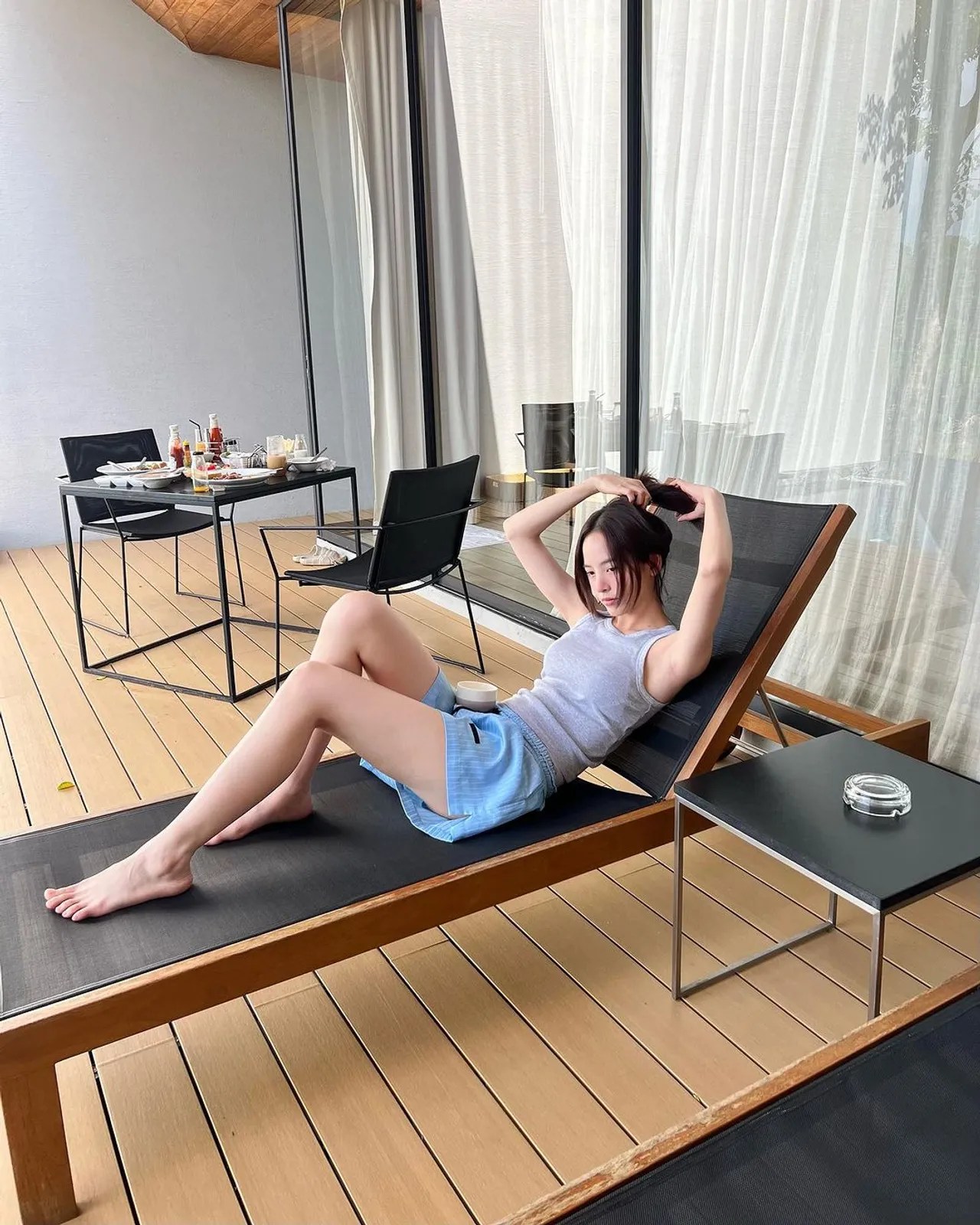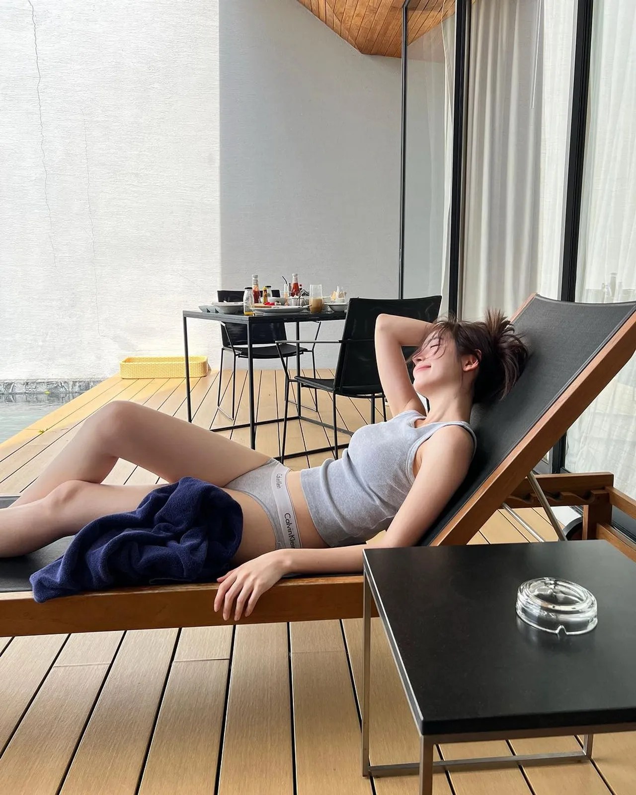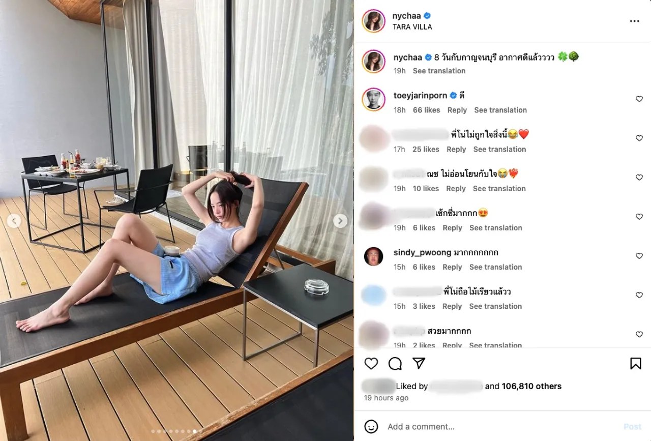 แต่งานนี้บอกเลยว่าภาพที่โพสต์ทำเอาไอจีไฟลุกไปเลย เพราะเป็นภาพที่ ณิชา ใส่ชุดสบายๆ ท่อนบนเป็นเสื้อกล้ามสีเทา ส่วนท่อนล่างที่ตอนแรกใส่กางเกงขาสั้นสีฟ้า แต่สุดท้ายถอดออกและทิ้งอยู่ในสระว่ายน้ำ เหลือเพียงกางเกงชั้นในสีเทาตัวจิ๋ว