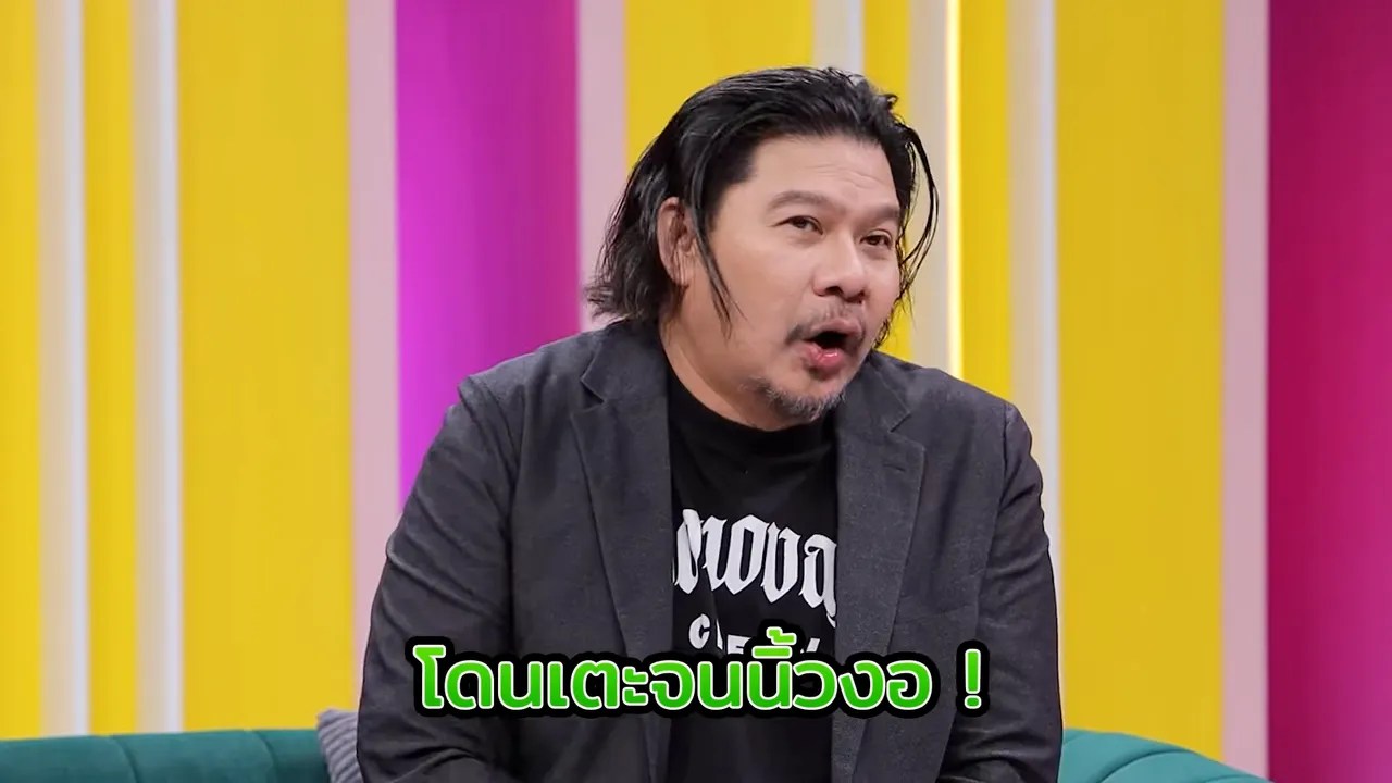 จากนั้น เสนาหอย ถามถึงเรื่องเคยถูกโหน่ง ชะชะช่า เตะจนนิ้วงอ นุ้ย เชิญยิ้ม เล่าว่า “ตอนนั้นไปเกี่ยวกับยาเสพติด นิ้วงออยู่เลย เล็บเสียหมดเลย เพราะลอยคอดม ตอนนั้นไปเล่นที่สุราษฎร์ธานี อ.นาสาร มันเป็นช่วงหน้าน้ำ และมันจะมีท้องร่องเหมือนสไลเดอร์สวนสยาม
