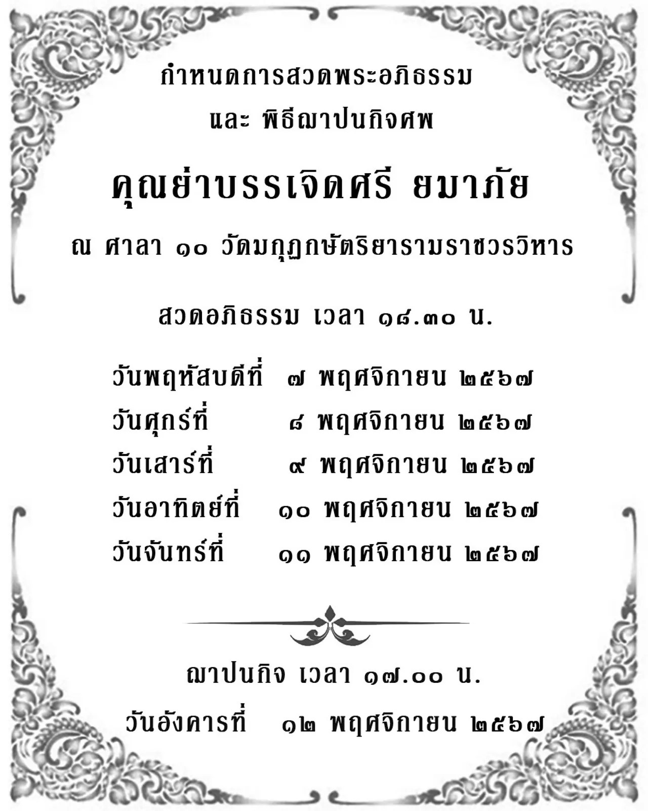 ทางครอบครัวได้เปิดเผยกำหนดการพิธีศพ คุณยายบรรเจิดศรี โดยมีพิธีสวดพระอภิธรรม ตั้งแต่วันพฤหัสบดีที่ 7 ถึงวันจันทร์ที่ 11 พฤศจิกายน 2567 เวลา 18.30 น. ณ ศาลา 10 วัดมกุฏกษัตริยาราม และมีพิธีฌาปนกิจศพวันอังคารที่ 12 พฤศจิกายน 2567