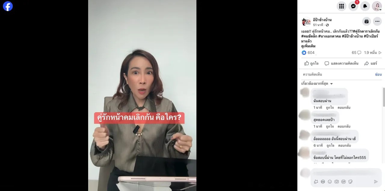 กลายเป็นประเด็นร้อน เมื่อเพจบันเทิงดัง อีป้าข้างบ้าน โพสต์คลิป ป้าเปียร์ เล่าถึงคู่รักดาราหน้าคมเลิกกันแล้ว โดยฝ่ายหญิงเป็นนางเอกตาคมยุค 90 ฝ่ายชายเป็นพระเอกหน้าคมยุค Y2K พร้อมทั้งเขียนแคปชั่น “เฉลย!! คู่รักหน้าคม.. เลิกกันแล้ว??”