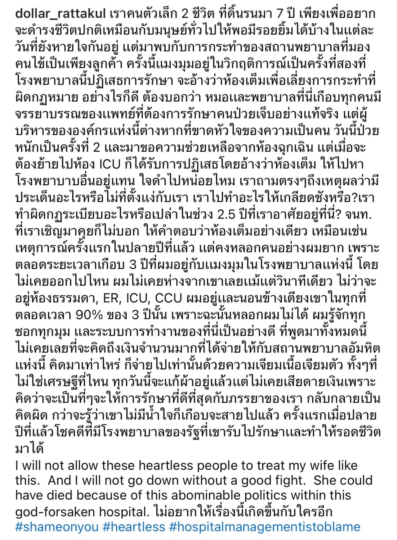 I will not allow these heartless people to treat my wife like this. And I will not go down without a good fight. She could have died because of this abominable politics within this god-forsaken hospital. ไม่อยากให้เรื่องนี้เกิดขึ้นกับใครอีก #shameonyou #heartless #hospitalmanagementistoblame”