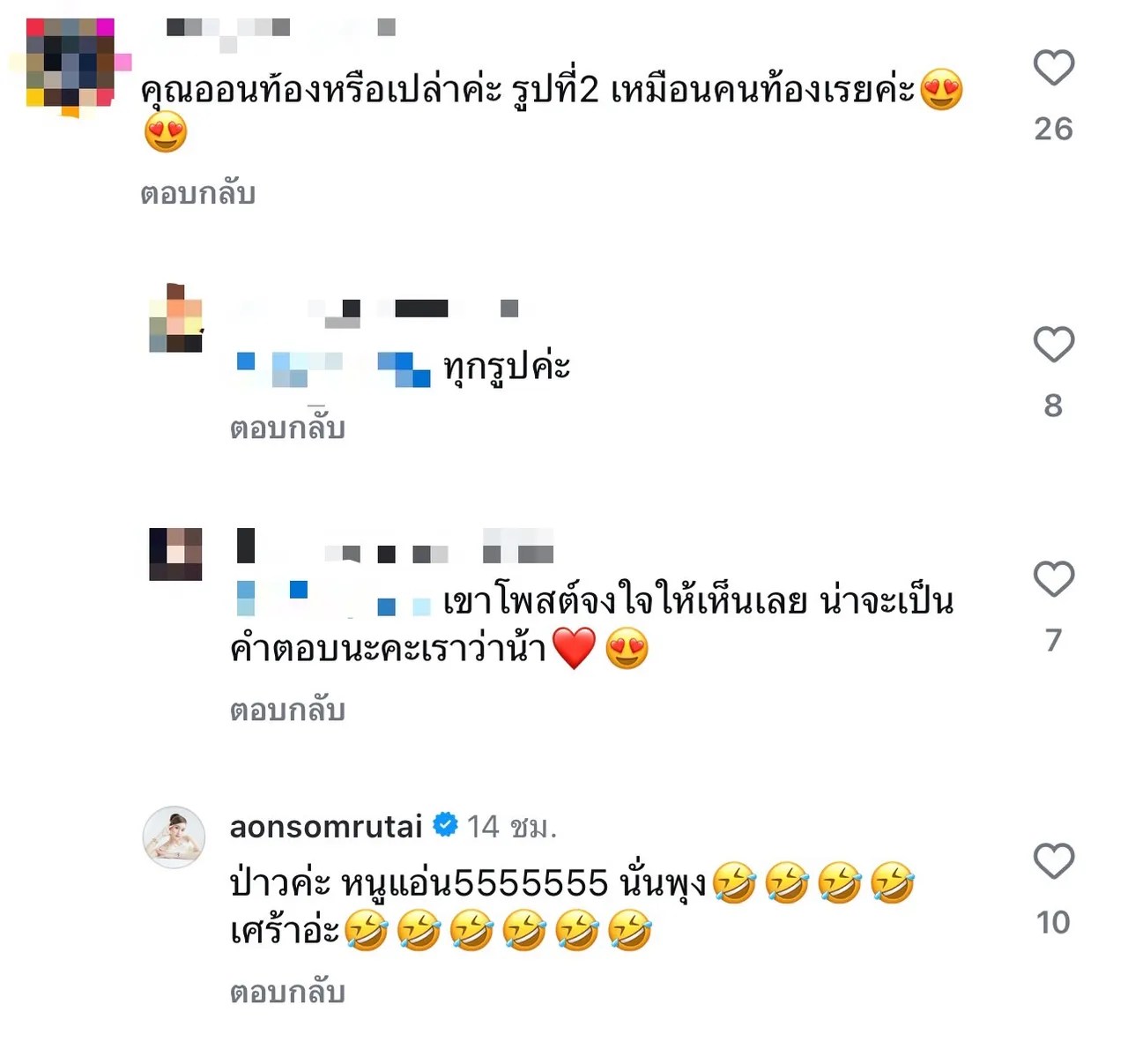 งานนี้ภาพที่ถูกโพสต์ออกไป หลายคนต่างโฟกัสไปที่ น้องออน โดยเฉพาะท้องน้อยๆ ที่นูนเด่นอย่างเห็นได้ชัดเจน เลยอดสงสัยไม่ได้ว่าจะมีข่าวดีหรือเปล่า และไม่ปล่อยให้คนรอนาน สาวออน ก็ได้ออกมาชี้แจงแล้วว่า “ป่าวค่ะ หนูแอ่น5555555 นั่นพุง เศร้าอ่ะ’ และ ‘Hi girls!!! I’m not pregnant that’s my belly!!”