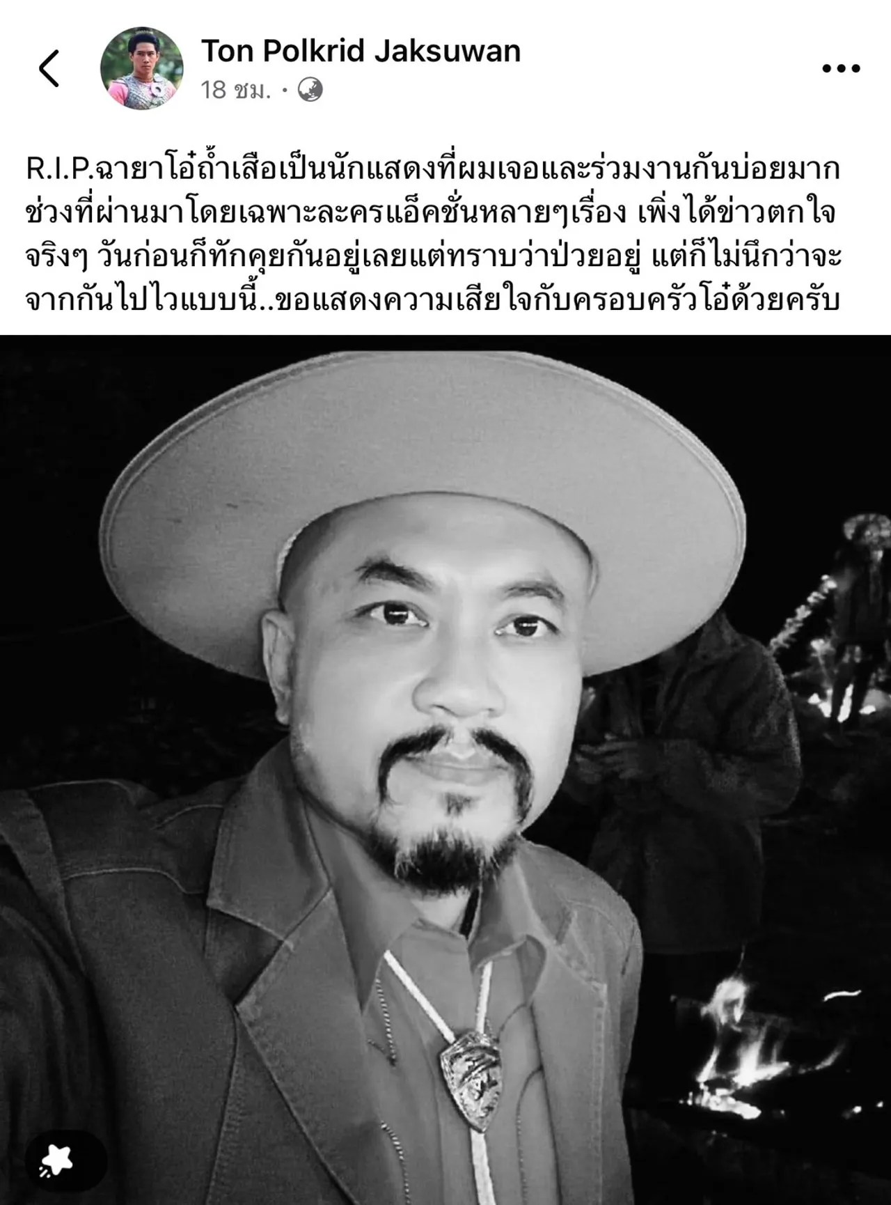 ล่าสุด ต้น พลกฤษณ์ นักแสดงละครพื้นบ้านจักรๆ วงศ์ๆ ได้ออกมาโพสต์ข้อความอาลัยผ่านโซเชียล โดยเผยว่า “R.I.P. โอ๋ ถ้ำเสือ” โดยกล่าวว่า ได้ร่วมงานกับ “โอ๋” บ่อยครั้งในหลายๆ ละครแอ็คชั่นที่ผ่านมา และเพิ่งได้มีโอกาสทักทายกันเมื่อไม่นานมานี้ โดยทราบว่า “โอ๋” ป่วย แต่ไม่คิดว่าจะจากไปเร็วขนาดนี้