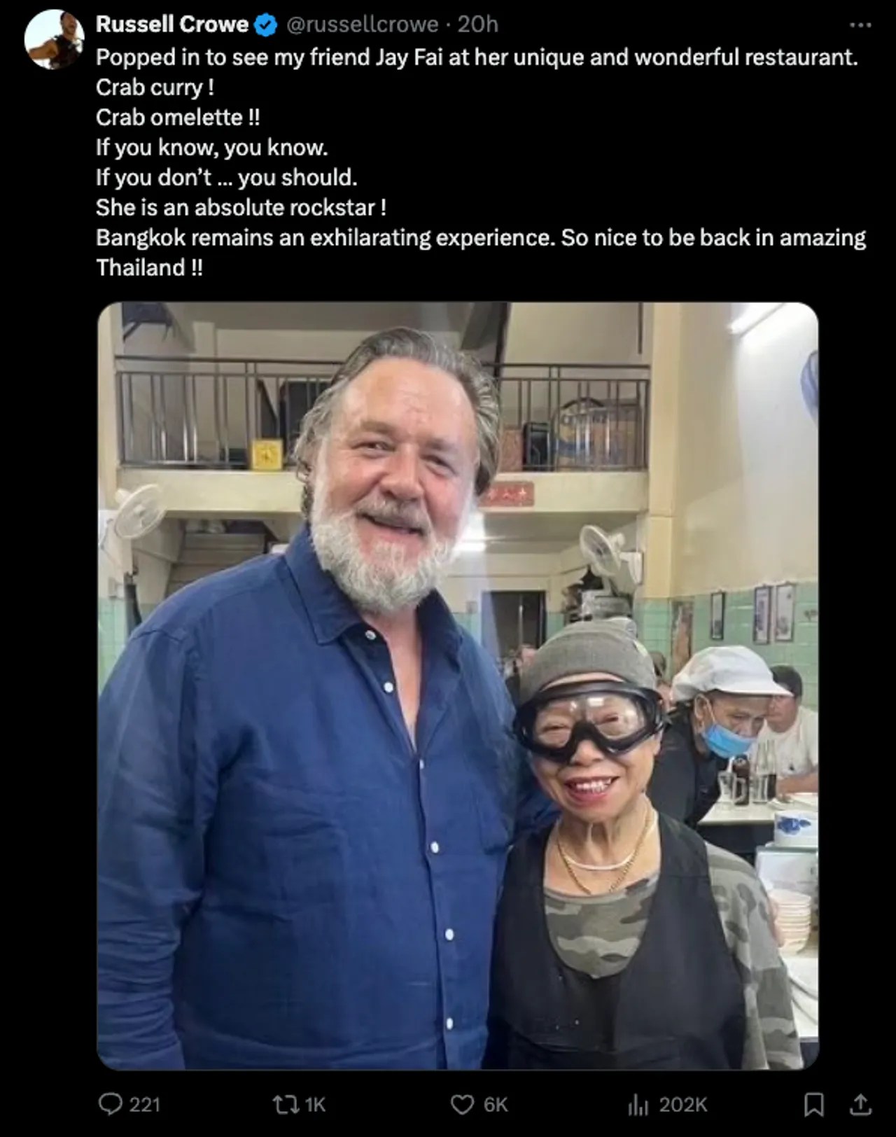 และการมาเมืองไทยครั้งล่าสุดนี้ รัสเซล โครว์ ก็ได้โพสต์ภาพคู่กับ เจ๊ไฝ เจ้าของร้านอาหารชื่อดัง ลงในทวิตเตอร์ (X) พร้อมทั้งเขียนข้อความว่า