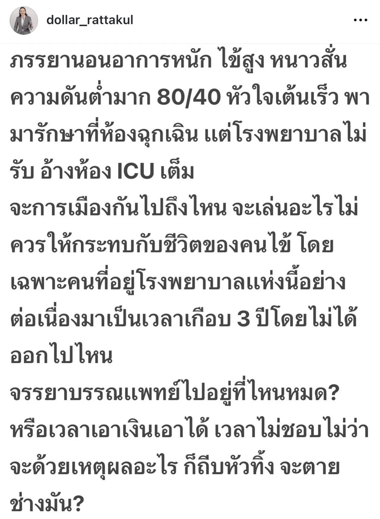 ซึ่งระบุว่า “ภรรยานอนอาการหนัก ไสูง หนาวสั่น ความดันต่ำมาก 80/40 หัวใจเต้นเร็ว พามารักษาที่ห้องฉุกเฉิน แต่โรงพยาบาลไม่รับ อ้างห้อง ICU เต็ม จะการเมืองกันไปถึงไหน จะเล่นอะไรไม่ควรกระทบกับชีวิตของคนไข้ โดยเฉพาะคนที่อยู่โรงพยาบาลแห่งนี้อย่างต่อเนื่องมาเป็นเวลาเกือบ 3 ปี โดยไม่ได้ออกไปไหน จรรยาบรรณแพทย์ไปอยู่ที่ไหนหมด ? หรือเวลาเอาเงินเอาได้ เวลาไม่ชอบไม่ว่าจะด้วยเหตุผมอะไร ก็ถีบหัวทิ้ง จะตายช่างมัน?”