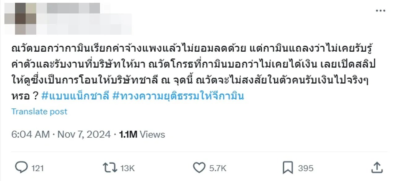 หลังจากที่ กามิน TikToker สาวเกาหลี บินมาเมืองไทยเพื่อแถลงข่าวชี้แจงกับสื่อมวลชนกรณีจบความสัมพันธ์กับพระเอกหนุ่ม แน็ก ชาลี รวมทั้งเคลียร์ประเด็นร้อนต่างๆ ที่เกิดขึ้น และบอกว่าเตรียมจะฟ้อง 5 บุคคล จนกลายเป็นกระแสร้อนในโซเชียล ส่วนเรื่องที่ ณวัฒน์ อิสรไกรศีล บิ๊กบอสเวทีนางงามมิสแกรนด์ฯ เผยว่าเคยโอนเงินค่าตัวไลฟ์สดครั้งละ 1 ล้าน กามิน ชี้แจงว่า ตนไม่ได้รับไลฟ์ละล้าน แทบจะไม่ทราบเลยว่าผู้ว่าจ้างจ้างเท่าไร เพราะได้รับเป็นเงินเดือนจากทางบริษัท