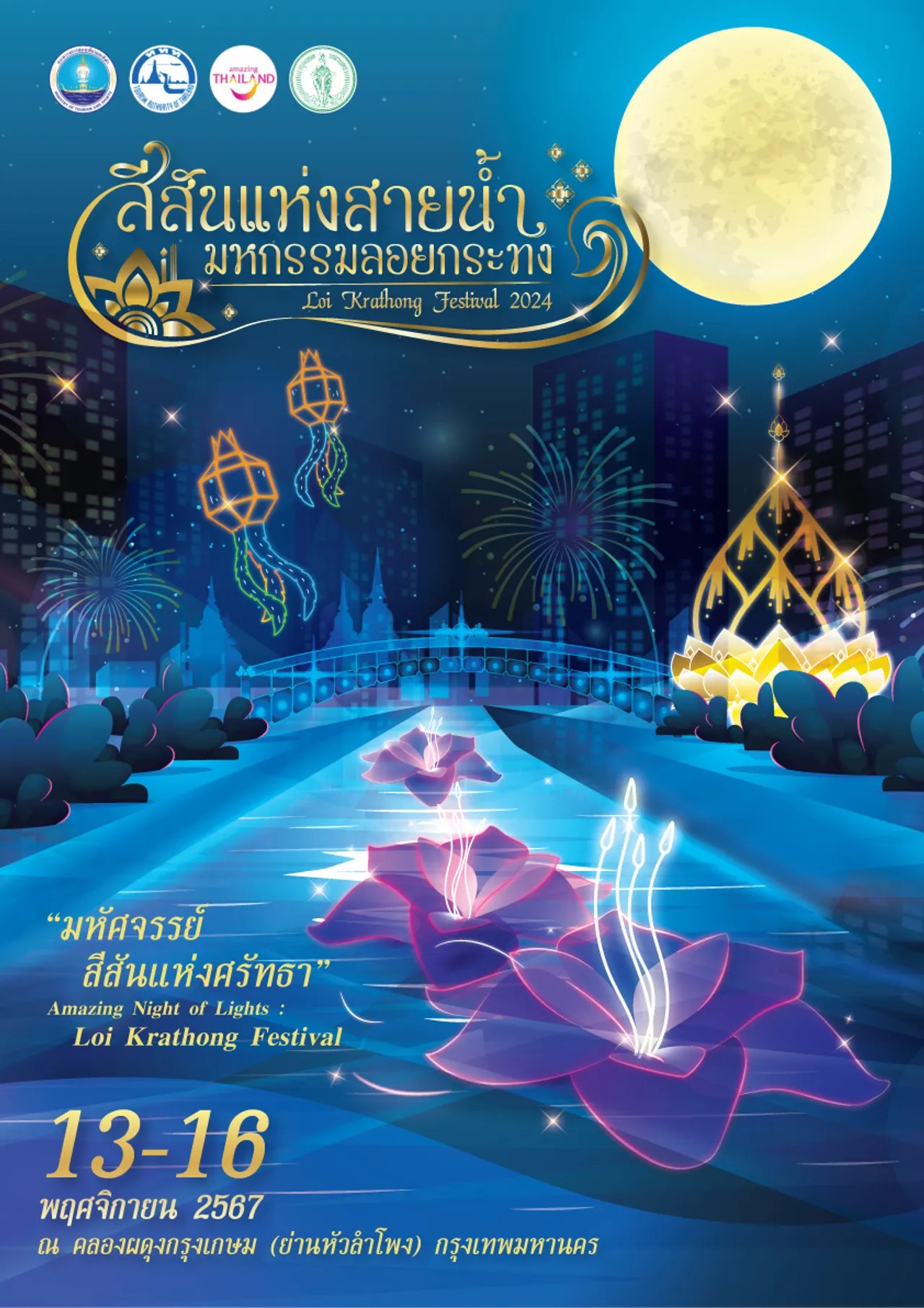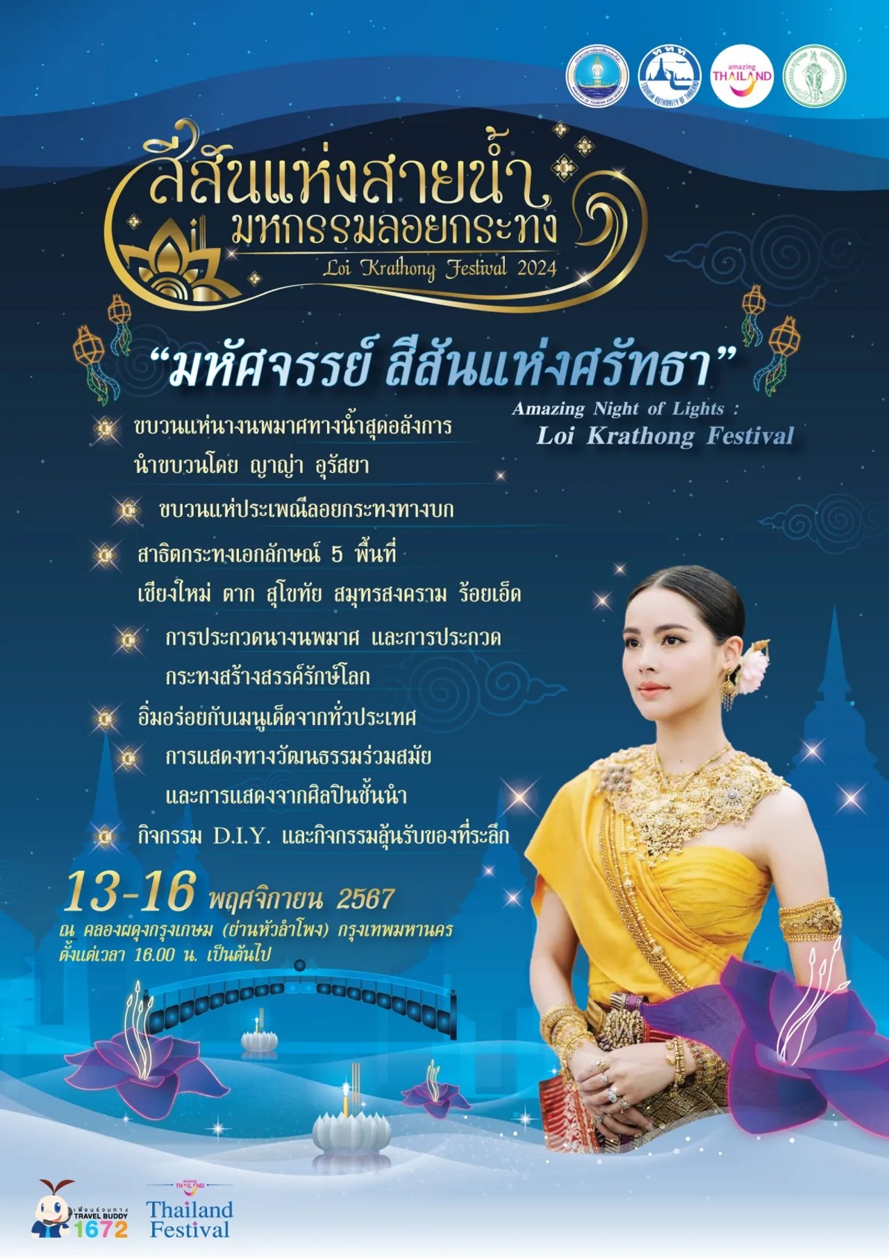 จัดเต็มกิจกรรมน่าสนใจภายใต้บรรยากาศการตกแต่งแบบมหัศจรรย์แห่งแสงไฟ Lights Installation ทั้งนี้ ททท. ได้เชิญ ญาญ่า อุรัสยา เสปอร์บันด์ นักแสดงชื่อดังเป็นนางนพมาศ ร่วมขบวนแห่ประเพณีลอยกระทงทางน้ำในวันที่ 15 พฤศจิกายน 2567