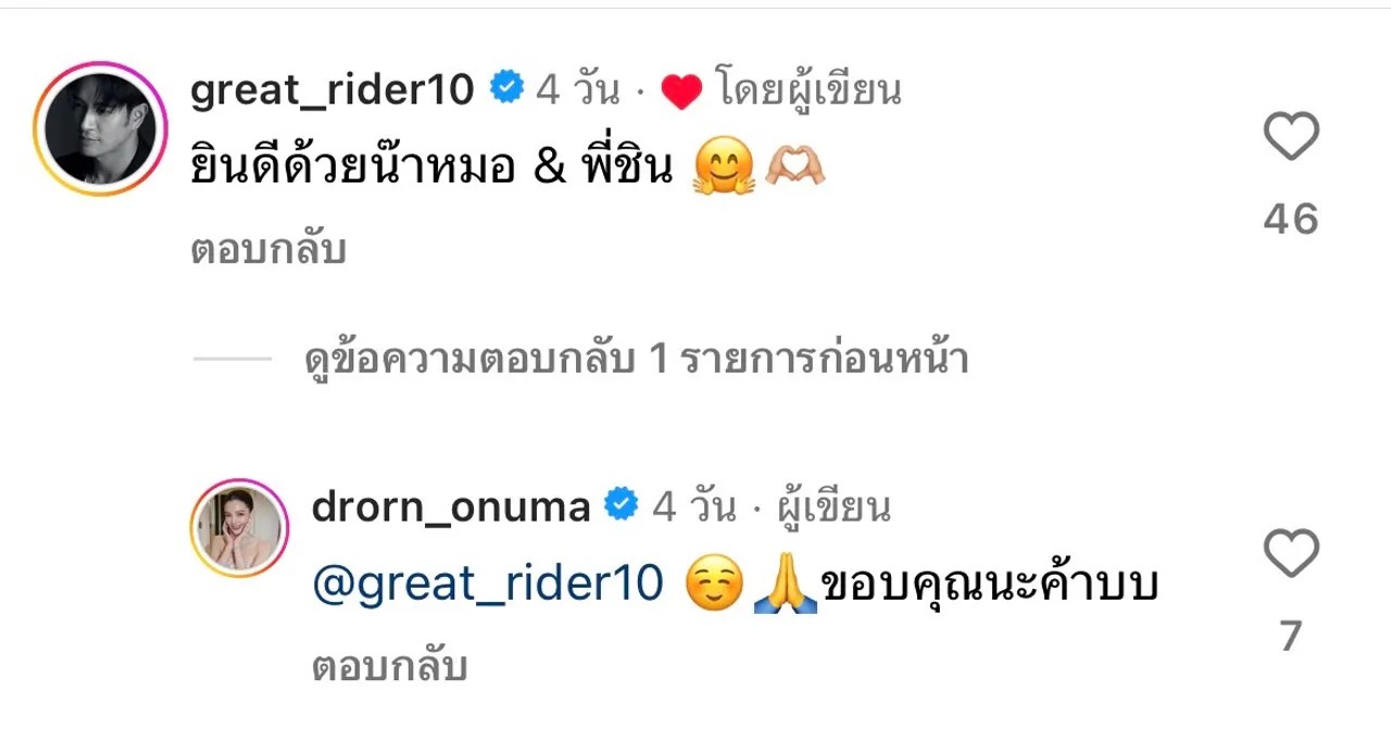 โดยก่อนหน้านี้ที่ หมออร ประกาศข่าวดีหลังถูกแฟนทำเซอร์ไพรส์คุกเข่าขอแต่งงาน เกรท วรินทร ก็ไปคอมเมนต์ร่วมยินดีกับหมออรว่า “ยินดีด้วยค้าบบบ” ซึ่งทางหมออร ก็ได้คอมเมนต์ตอบกลับเป็นอีโมจิดีใจและรูปหัวใจสีแดงในข้อความดังกล่าวของหนุ่มเกรทด้วย