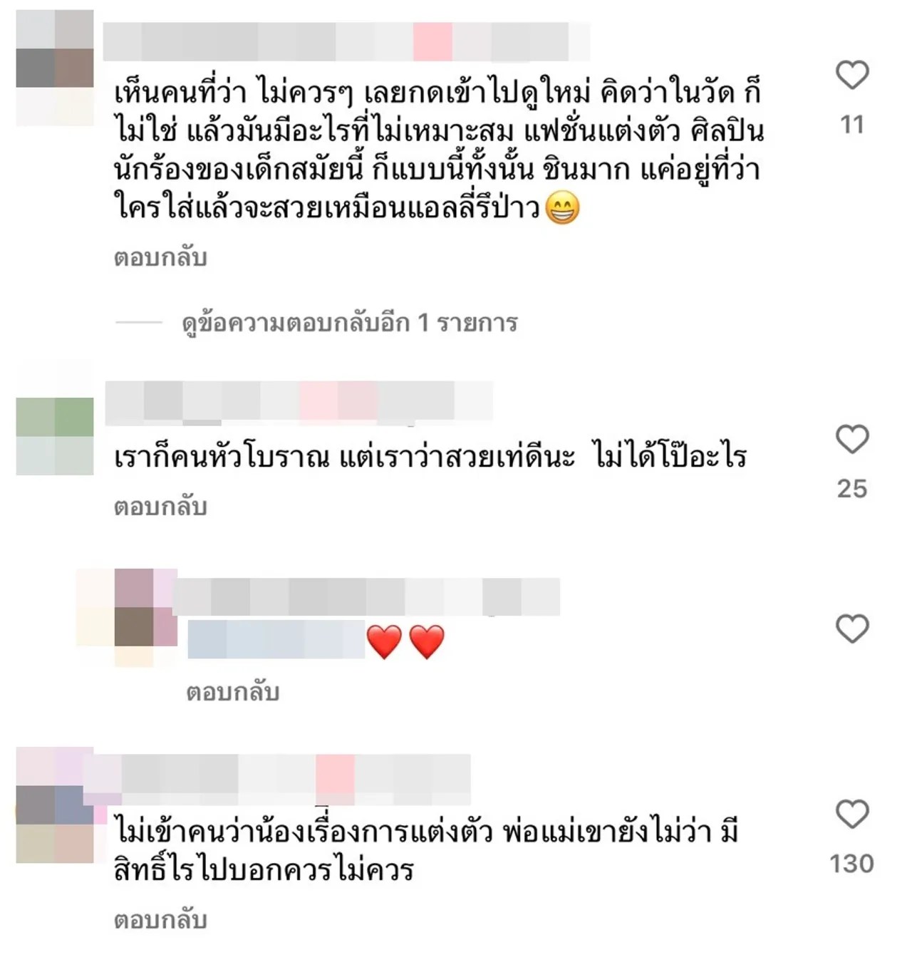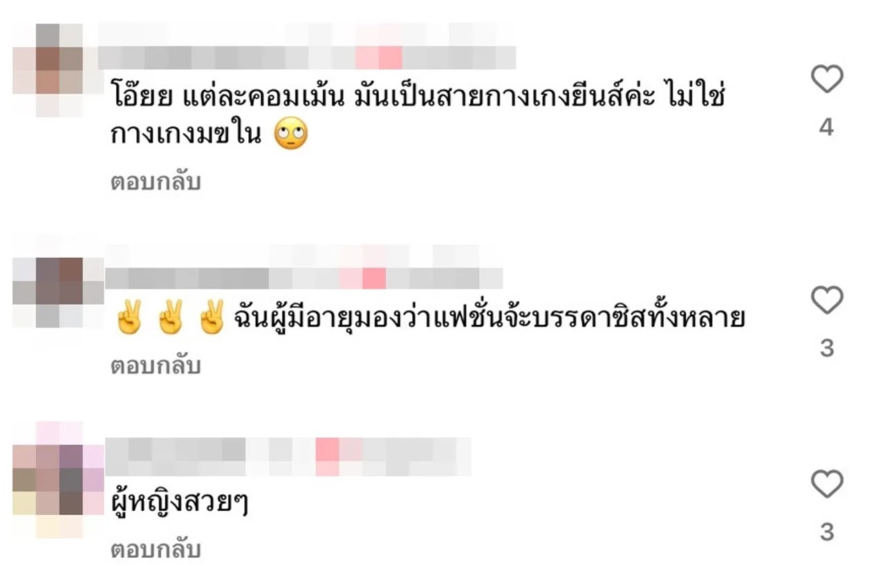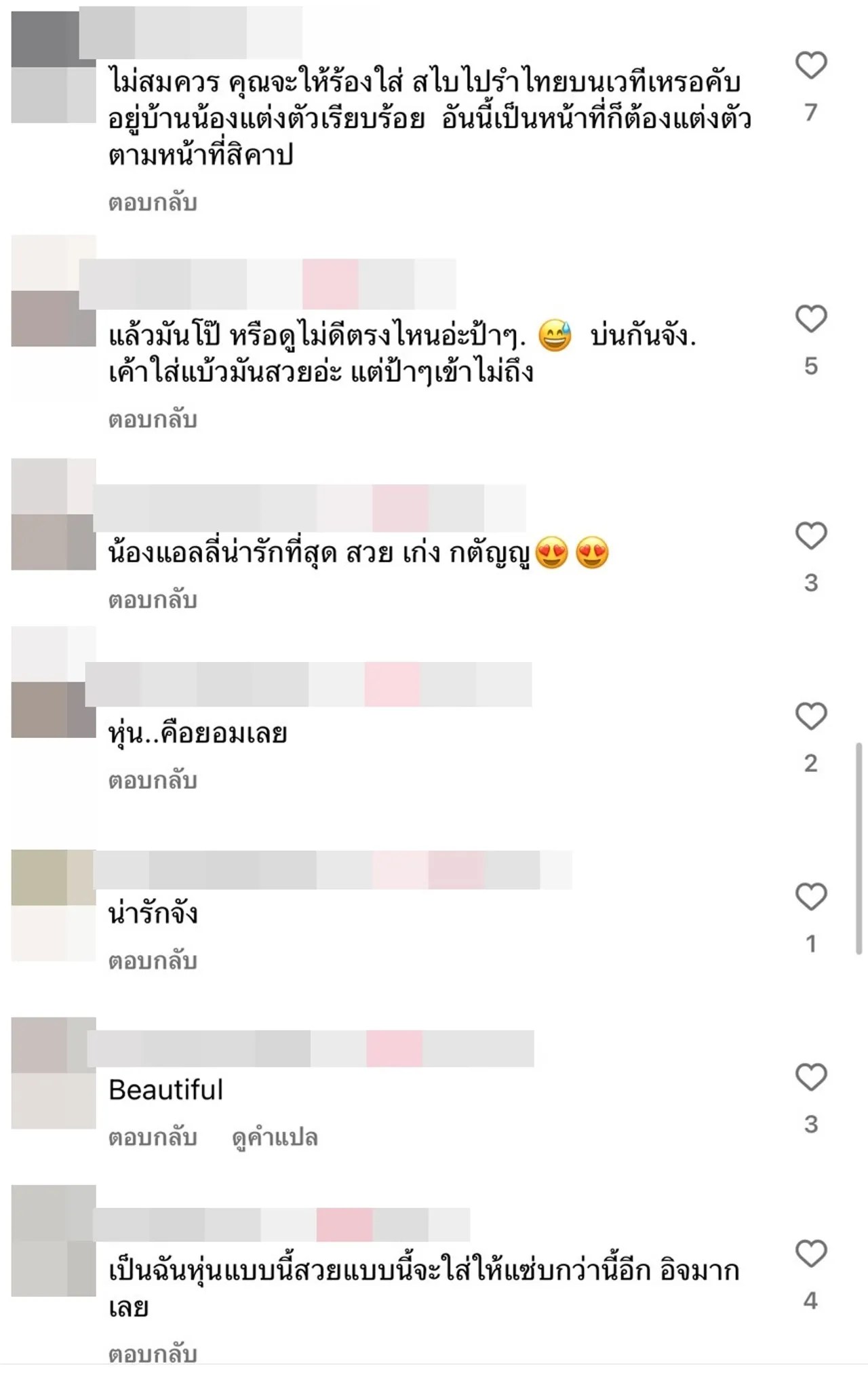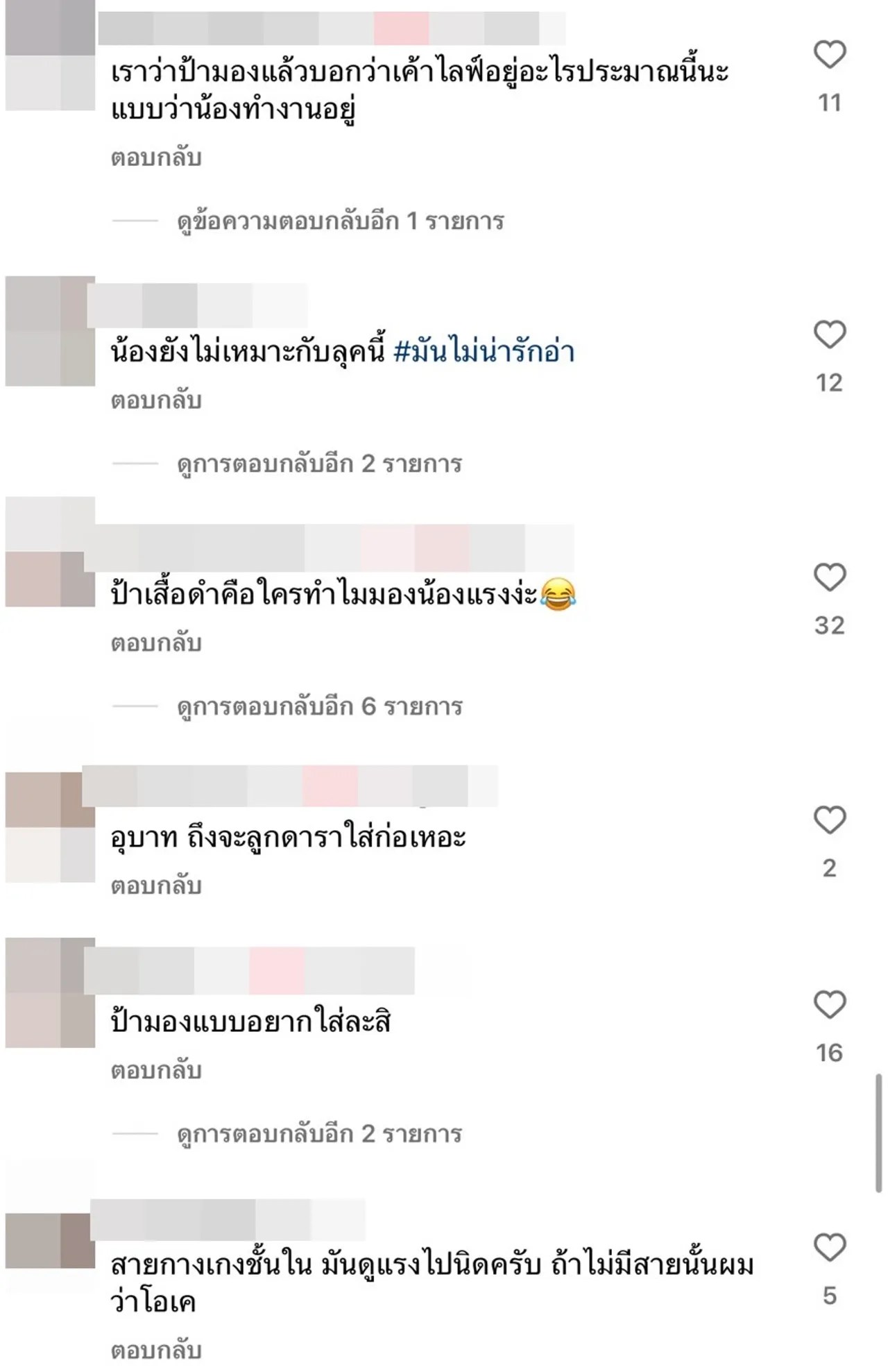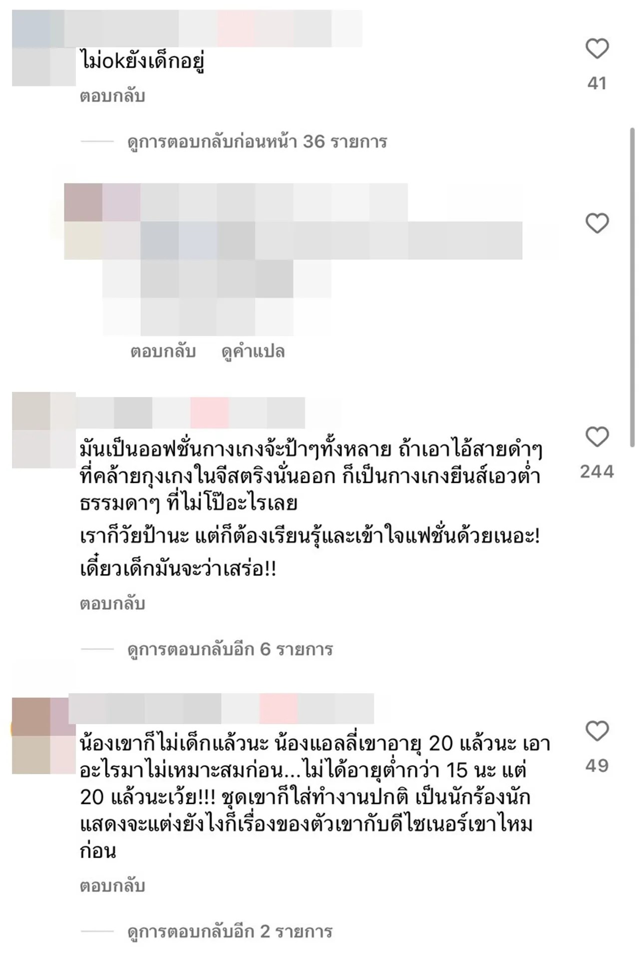 โอ๊ยย แต่ละคอมเมนต์ มันเป็นสายกางเกงยีนส์ค่ะ ไม่ใช่กางเกงใน, กางเกงปกตินั้นละ แค่มีสายเพิ่มมาเฉยๆ ให้ดูสวยขึ้น จบ, ไม่สมควร คุณจะให้ร้องใส่ สไบไปรำไทยบนเวทีเหรอคับ อยู่บ้านน้องแต่งตัวเรียบร้อย อันนี้เป็นหน้าที่ก็ต้องแต่งตัว ตามหน้าที่สิคร้าบ, เหมือนป้าเสื้อดำแกมองที่กล้อง แล้วบอกว่าเค้าไลฟ์อยู่ ประมาณนี้ป่ะ ฯลฯ