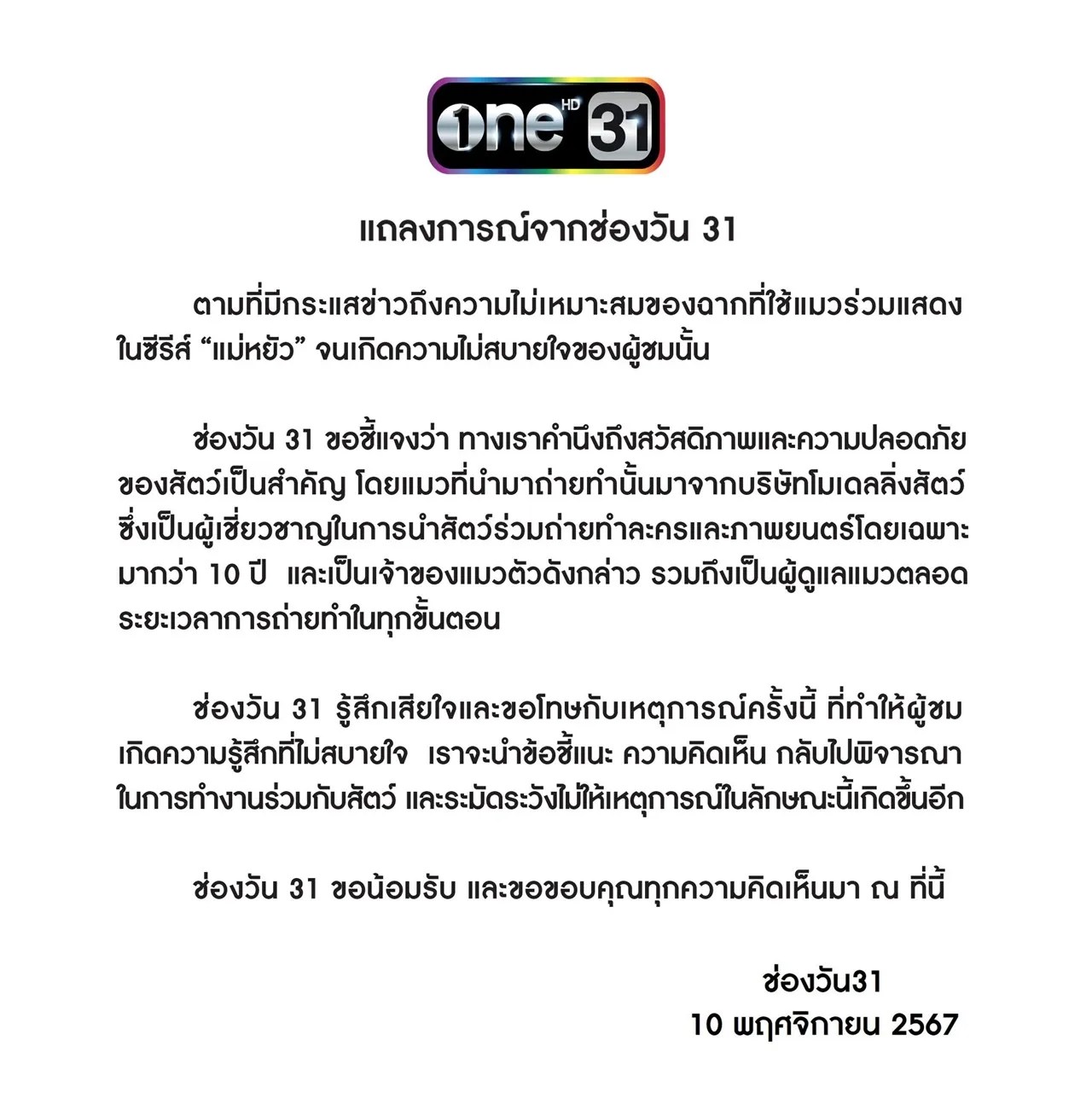 ช่องวัน 31 ขอชี้แจงว่า ทางเราคำนึงถึงสวัสดิภาพและความปลอดภัยของสัตว์เป็นสำคัญ โดยแมวที่นำมาถ่ายทำนั้นมาจากบริษัทโมเดลลิ่งสัตว์ ซึ่งเป็นผู้เชี่ยวชาญในการนำสัตว์ร่วมถ่ายทำละครและภาพยนตร์โดยเฉพาะมากว่า 10 ปี และเป็นเจ้าของแมวตัวดังกล่าว รวมถึงเป็นผู้ดูแลแมวตลอด ระยะเวลาการถ่ายทำในทุกขั้นตอน