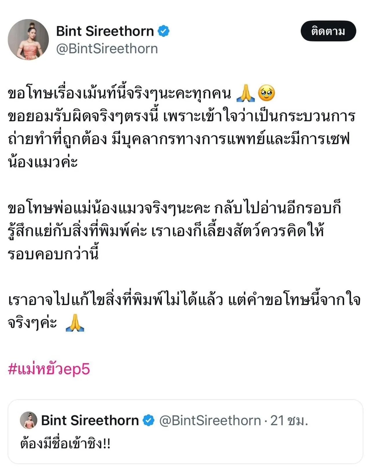 – ยังมีการตำหนิ บิ๊นท์ สิรีธร ลีห์อร่ามวัฒน์ หนึ่งในนักแสดงในเรื่อง ซึ่งเคยเป็นเภสัชกรมาก่อน แต่กลับโพสต์แสดงความคิดเห็นเกี่ยวกับฉากแมวว่า “ต้องมีชื่อเข้าชิง!!” ซึ่งต่อมา บิ๊นท์ ได้โพสต์ขอโทษ และประกาศไม่สนับสนุนการทารุณกรรมสัตว์ทุกประเภท พร้อมกับเสนอให้ใช้ซีจี หรือม็อกอัพแทน