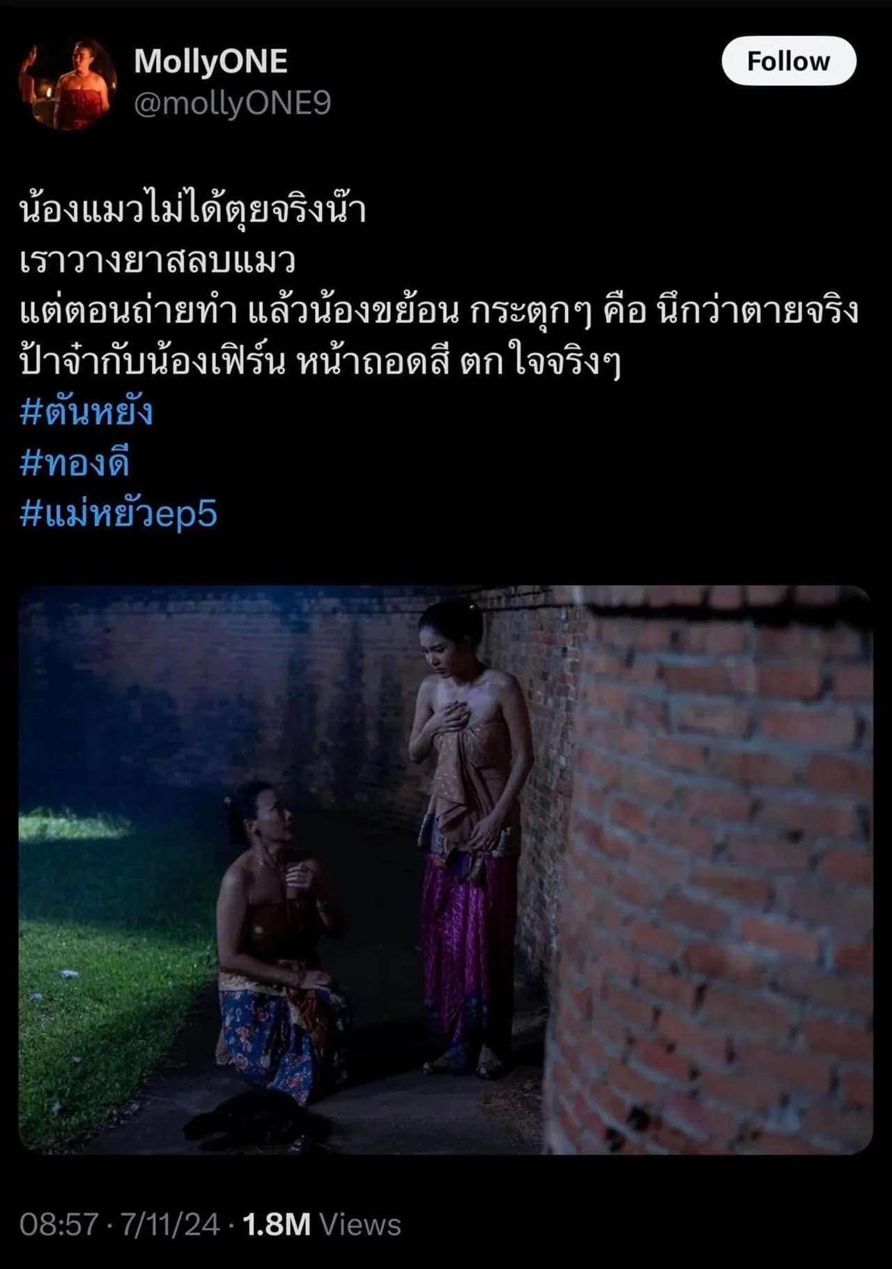 – ต่อมา “จ๋า โมฬีวรรณ” ที่รับบทเป็น ทองดี ได้ออกมาโพสต์ข้อความว่า “น้องแมวไม่ได้ตุยจริงน๊า เราวางยาสลบแมว แต่ตอนถ่ายทำน้องขย้อน กระตุก ๆ คือนึกว่าตายจริง ป้าจ๋ากับน้องเฟิร์นหน้าถอดสี ตกใจจริงๆ” ทำเอาหลายคนช็อก เพราะไม่นึกว่าเพื่อละครฉากเดียวถึงกับต้องวางยาสลบแมว อีกทั้งตัวนักแสดงเองยังทำเหมือนเป็นเรื่องธรรมดาอีกด้วย จนเกิดดราม่าหนัก และ จ๋า ก็ได้ลบโพสต์ทิ้งและปิดแอคเคานท์ไป
