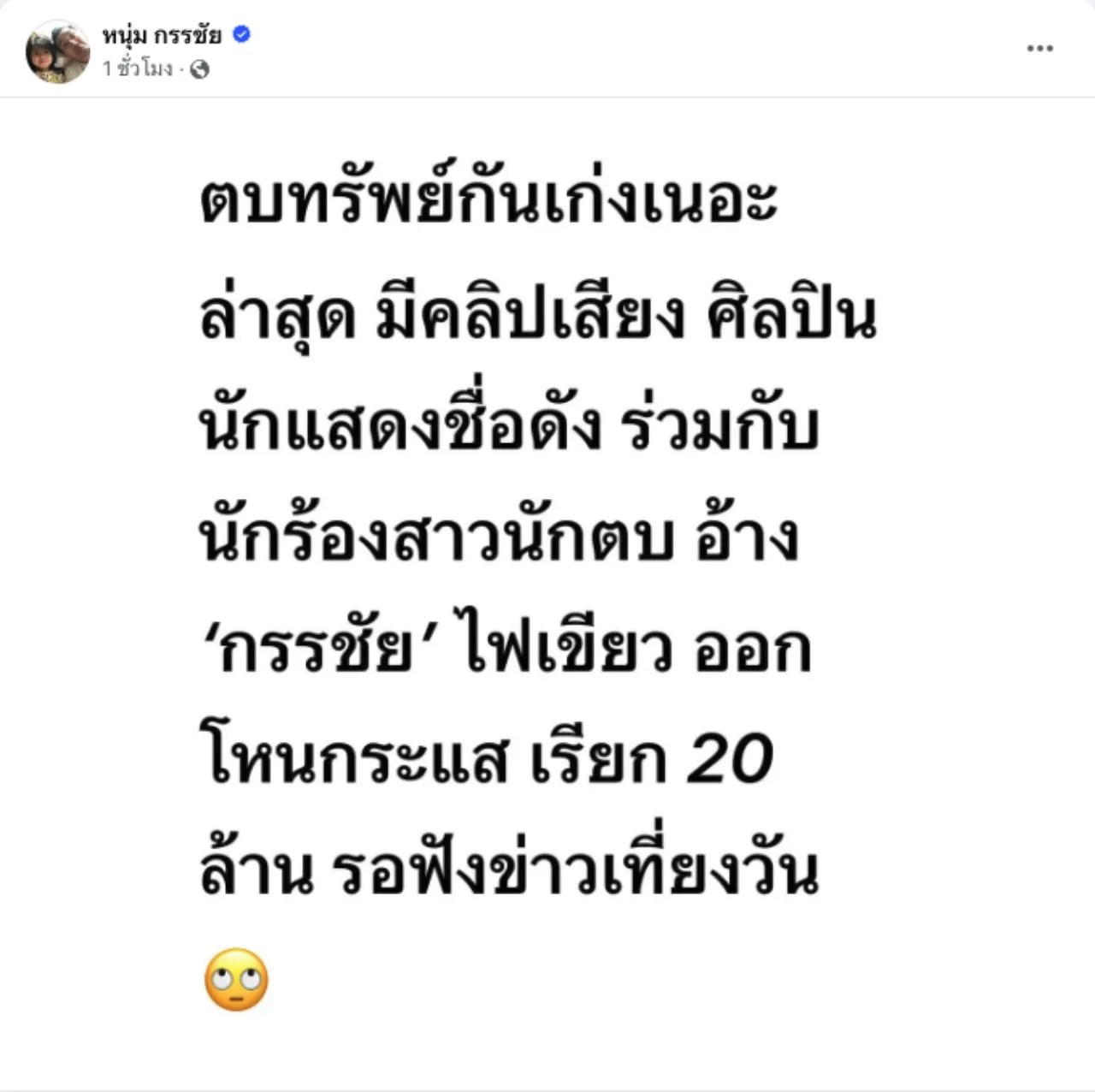 หลังจากที่ก่อนหน้านี้ หนุ่ม กรรชัย ได้ออกมาโพสต์เดือดผ่านทางโซเชียลของตัวเอง บอกว่า “ตบทรัพย์กันเก่งเนอะ ล่าสุด มีคลิปเสียง ศิลปิน นักแสดงชื่อดัง ร่วมกับนักร้องสาวนักตบ อ้าง ‘กรรชัย’ ไฟเขียว ออกโหนกระแส เรียก 20 ล้าน รอฟังข่าวเที่ยงวัน”