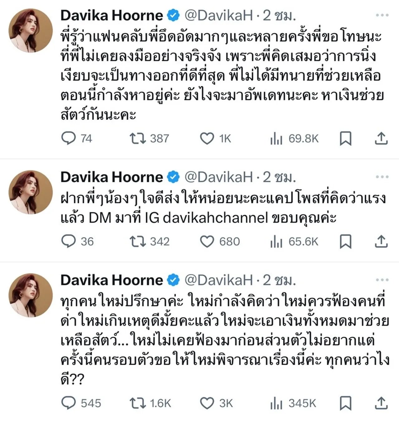 และข้อความ “พี่รู้ว่าแฟนคลับพี่อึดอัดมากๆ และหลายครั้งพี่ขอโทษนะที่พี่ไม่เคยลงมืออย่างจริงจัง เพราะพี่คิดเสมอว่าการนิ่งเงียบจะเป็นทางออกที่ดีที่สุด พี่ไม่ได้มีทนายที่ช่วยเหลือ ตอนนี้กำลังหาอยู่ค่ะ ยังไงจะมาอัปเดตนะคะ หาเงินช่วยสัตว์กันนะคะ”