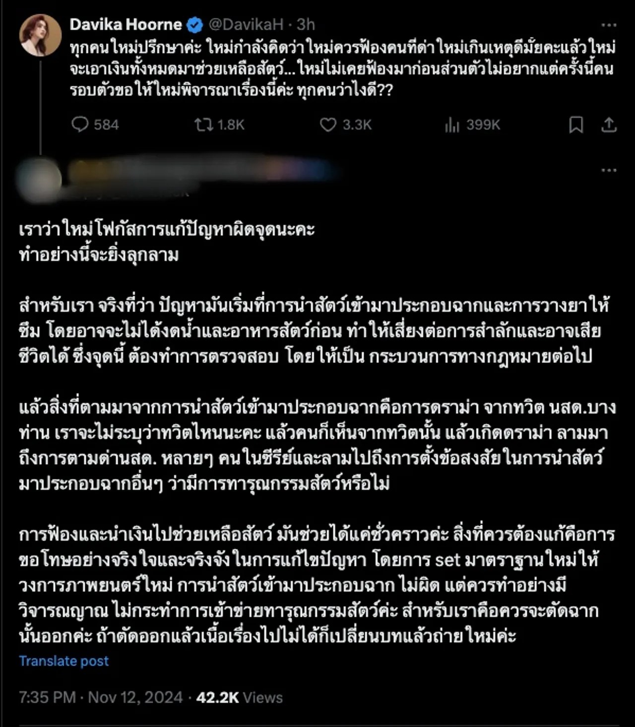 ล่าสุด ใหม่ ดาวิกา โพสต์ข้อความลงในทวิตเตอร์ (X) ในทำนองว่าปรึกษาว่าจะฟ้องคนที่ด่าเกินกว่าเหตุดีไหม จะได้นำเงินมาช่วยเหลือสัตว์ โดยบอกว่า “ทุกคนใหม่ปรึกษาค่ะ ใหม่กำลังคิดว่าใหม่ควรฟ้องคนที่ด่าใหม่เกินเหตุดีมั้ยคะ แล้วใหม่จะเอาเงินทั้งหมดมาช่วยเหลือสัตว์… ใหม่ไม่เคยฟ้องมาก่อน ส่วนตัวไม่อยาก แต่ครั้งนี้คนรอบตัวขอให้ใหม่พิจารณาเรื่องนี้ค่ะ ทุกคนว่าไงดี??”