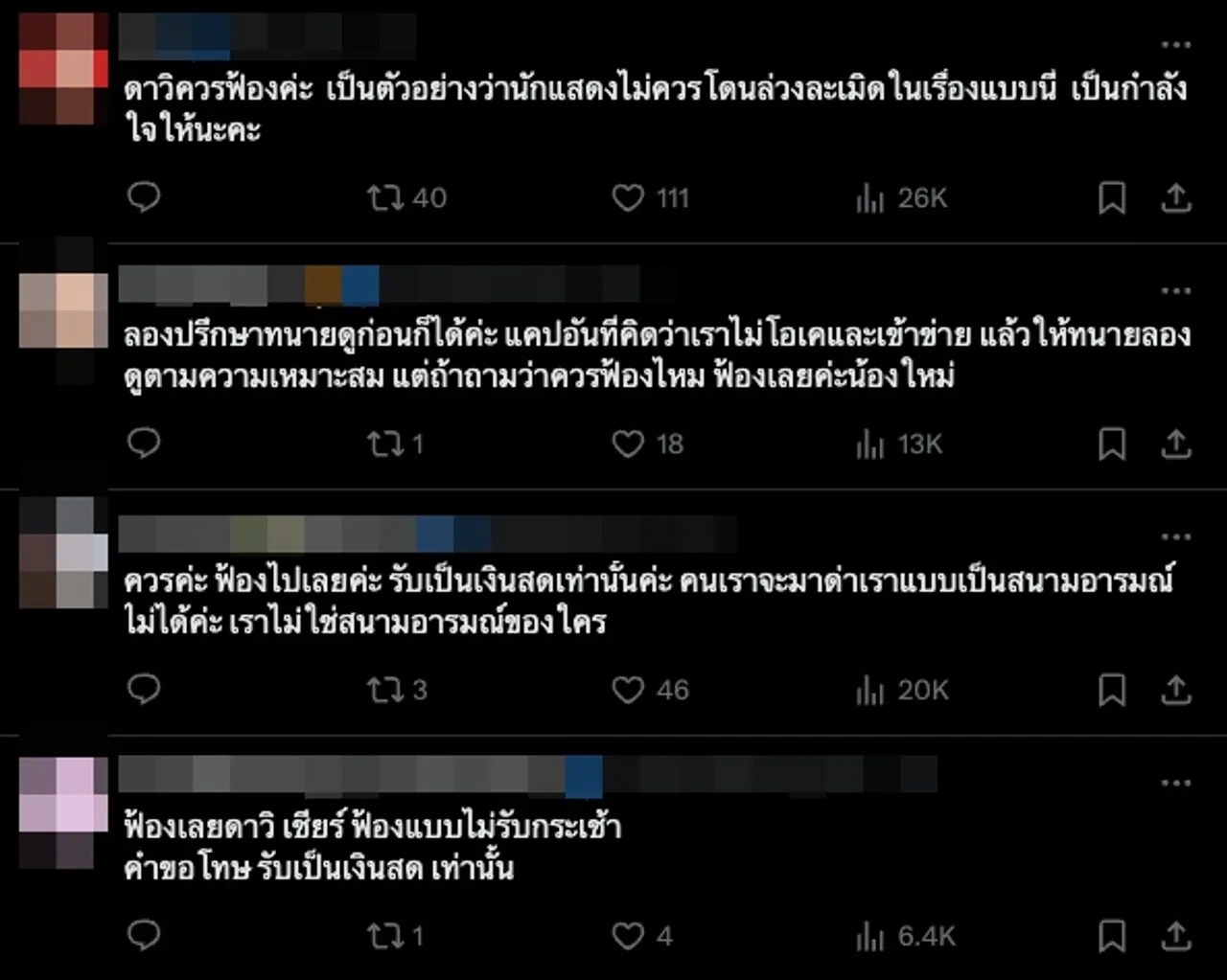 ซึ่งหลังจากที่ ใหม่ ดาวิกา โพสต์ไป ก็มีแฟนๆ จำนวนมากสนับสนุนให้ฟ้อง และรับเป็นเงินสด บ้างก็บอกว่าให้ลองปรึกษาทนายดูก่อน แล้วแคปอันที่คิดว่าไม่โอเคและเข้าข่าย ให้ทนายดูตามความเหมาะสม แต่ก็มีบางคนที่แสดงความคิดเห็นว่า ใหม่โฟกัสการแก้ปัญหาผิดจุด ทำแบบนี้จะยิ่งลุกลาม ฯลฯ