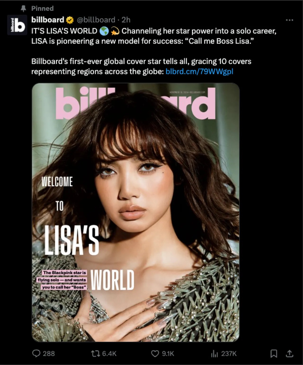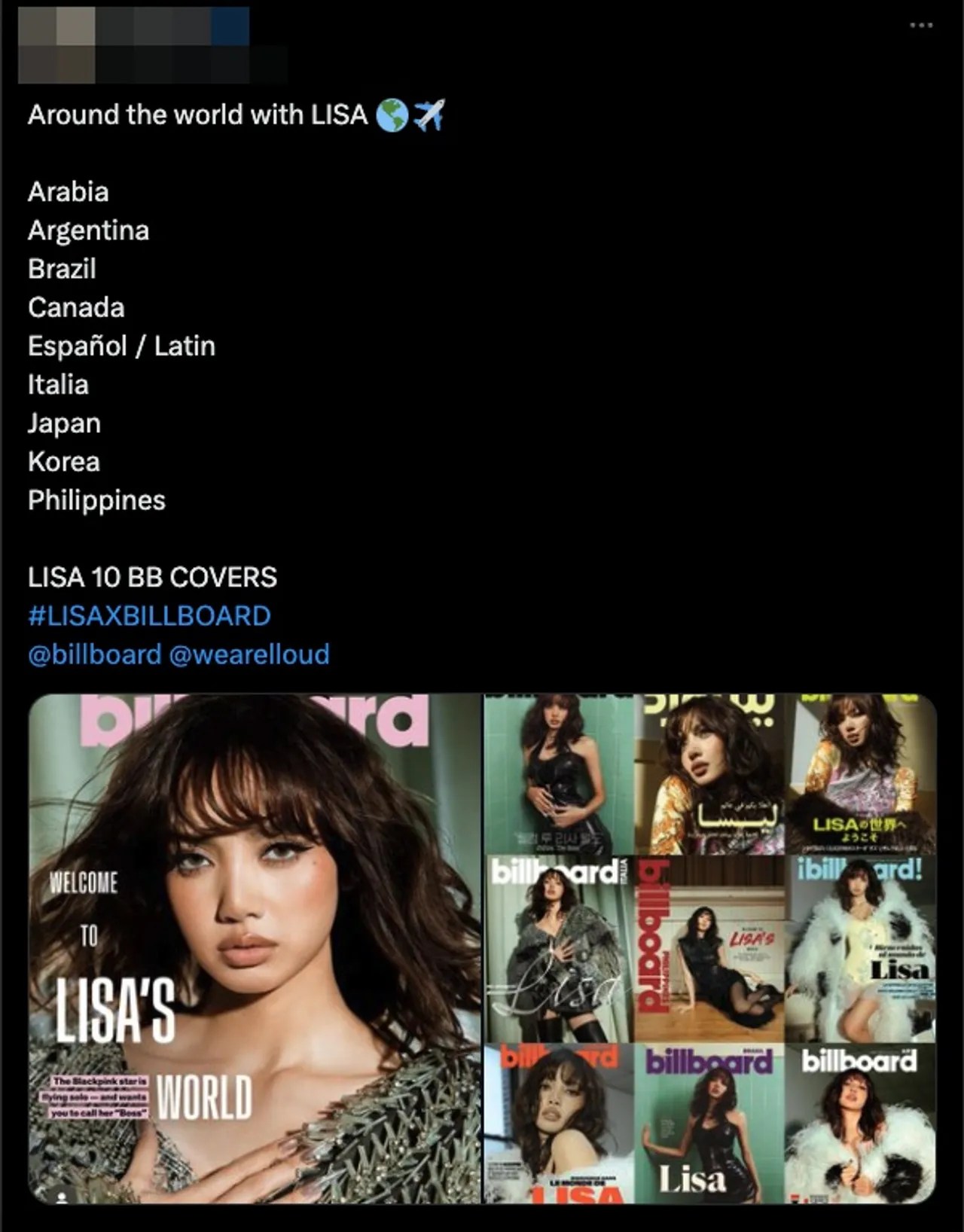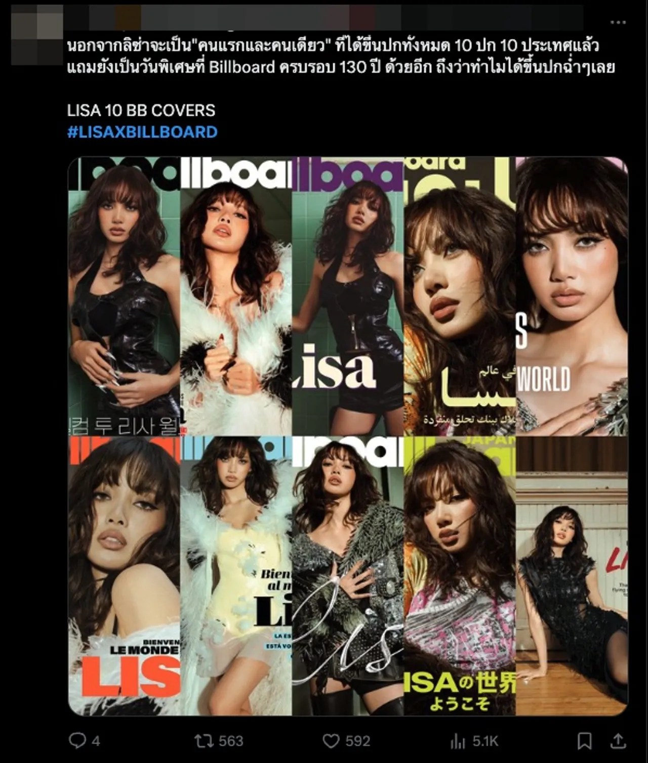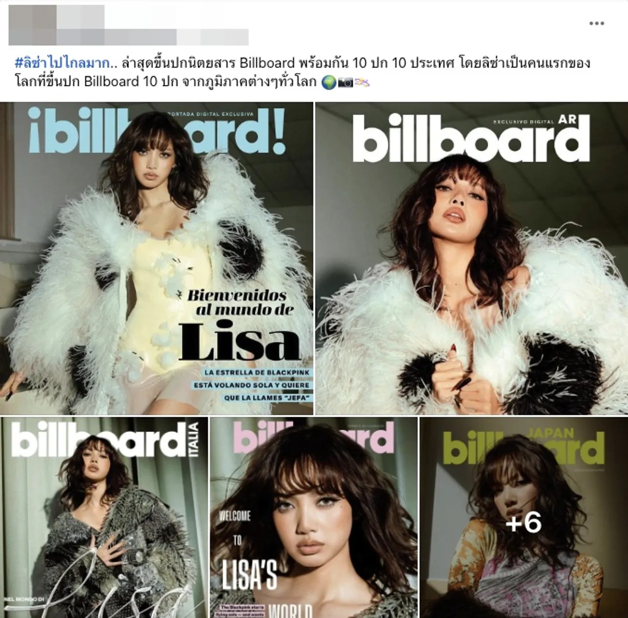โดยทางนิตยสาร BILLBOARD ระบุว่า เป็นศิลปินคนแรกที่ขึ้นปกของนิตยสาร 10 ปกจากภูมิภาคต่างๆ ทั่วโลก ทำให้แฟนๆ ต่างพูดถึงเรื่องนี้ในโลกออนไลน์เป็นจำนวนมาก พร้อมทั้งติดแฮชแท็ก #LISAxBILLBOARD ในทวิตเตอร์ (X) ด้วย